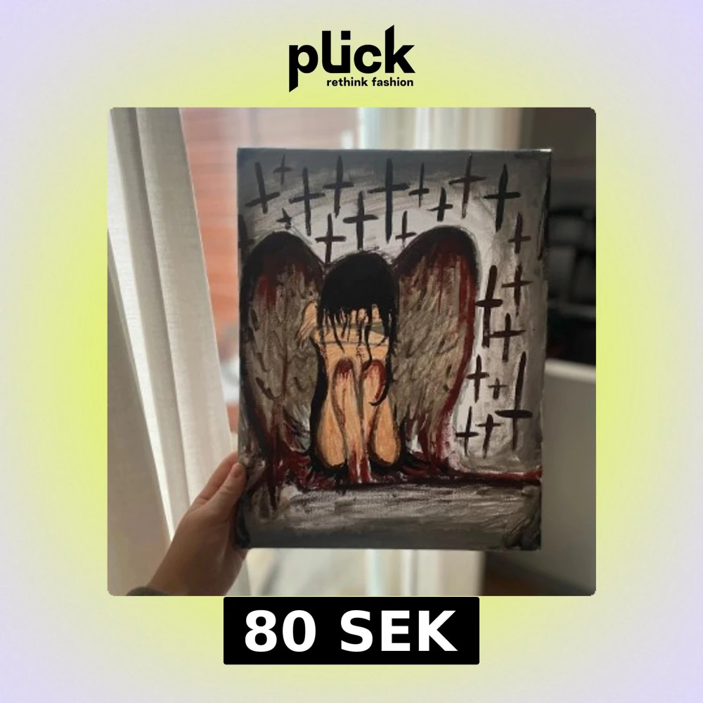 En dramatisk målning som föreställer en ängel med mörka vingar och ansiktet dolt i händerna. Bakgrunden är fylld med kors i olika storlekar, vilket ger en känsla av mystik och djup. Färgpaletten domineras av mörka toner med inslag av rött och grått, vilket förstärker den emotionella laddningen i verket.