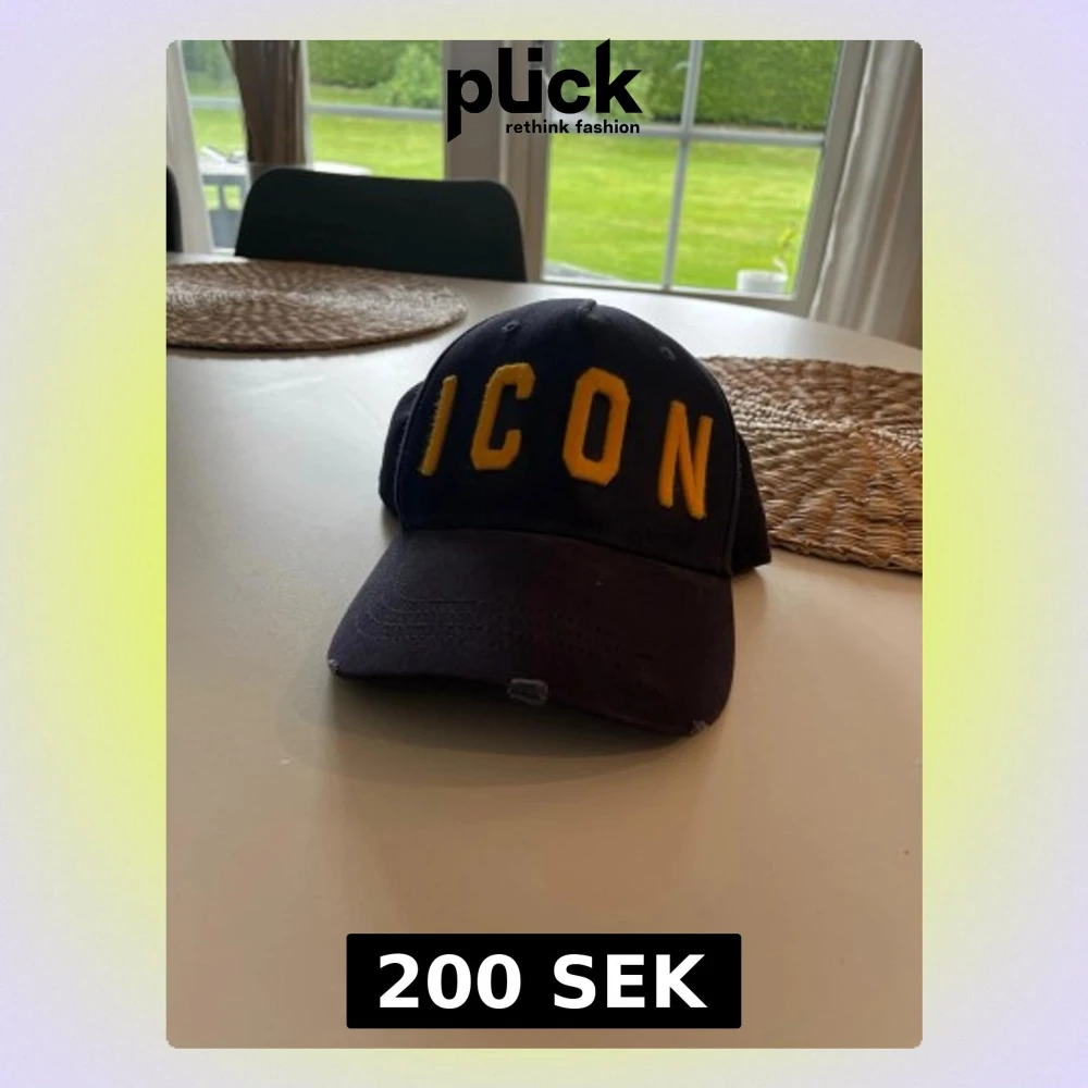 Snygg marinblå keps från Dsquared2 med stora gula bokstäver 'ICON' framtill och 'DSQUARED2' broderat baktill. Använd fåtal gånger, skick 9/10. Tillverkad i bomull för en bekväm känsla och cool look. Nypris ca 1300.