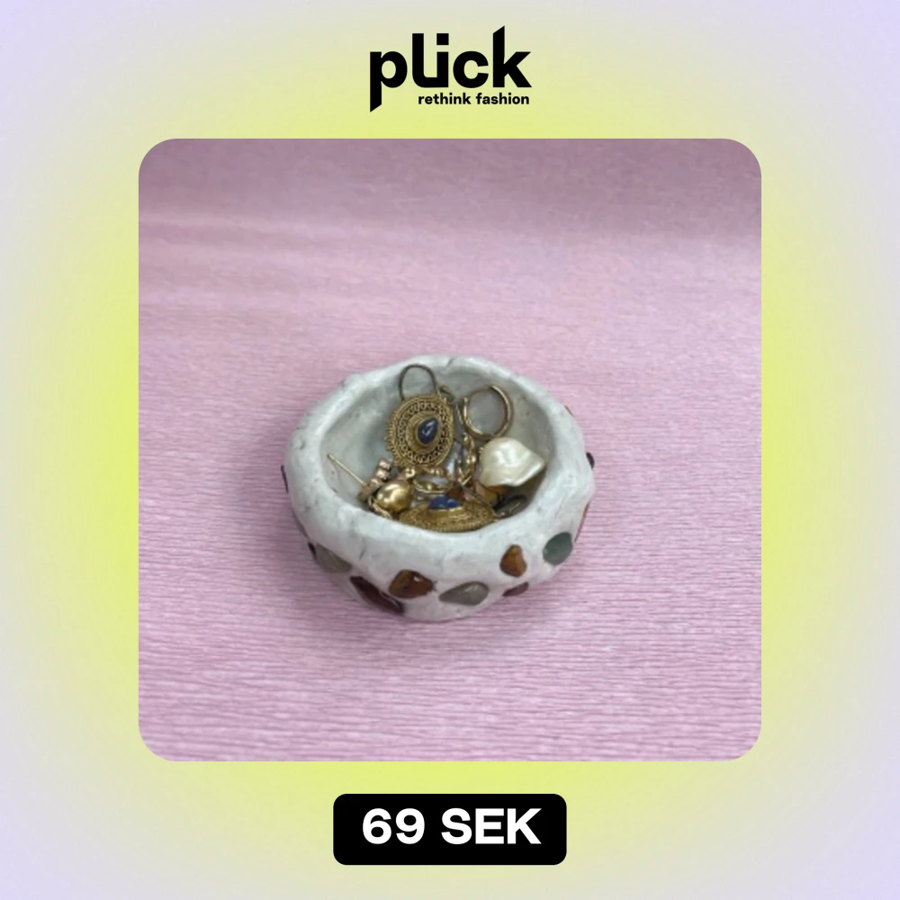 HEMMAGJORD!! En liten skål gjord i lera med stenar dekorerat på. Passar perfekt att ha sina ringar i eller andra småsaker.