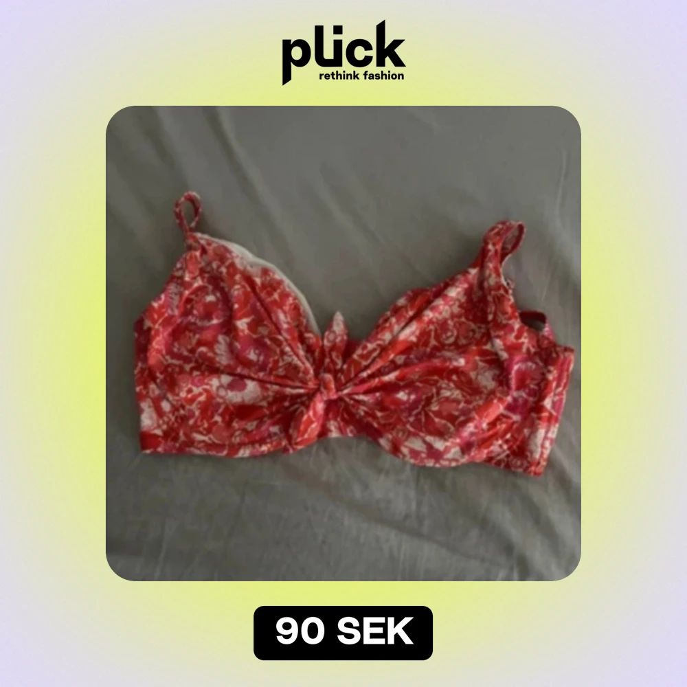 En röd och vit blommig bikiniöverdel från Ellos. Överdelen har justerbara axelband och en knytning framtill. Den har även en spänne baktill för att säkerställa en bra passform.