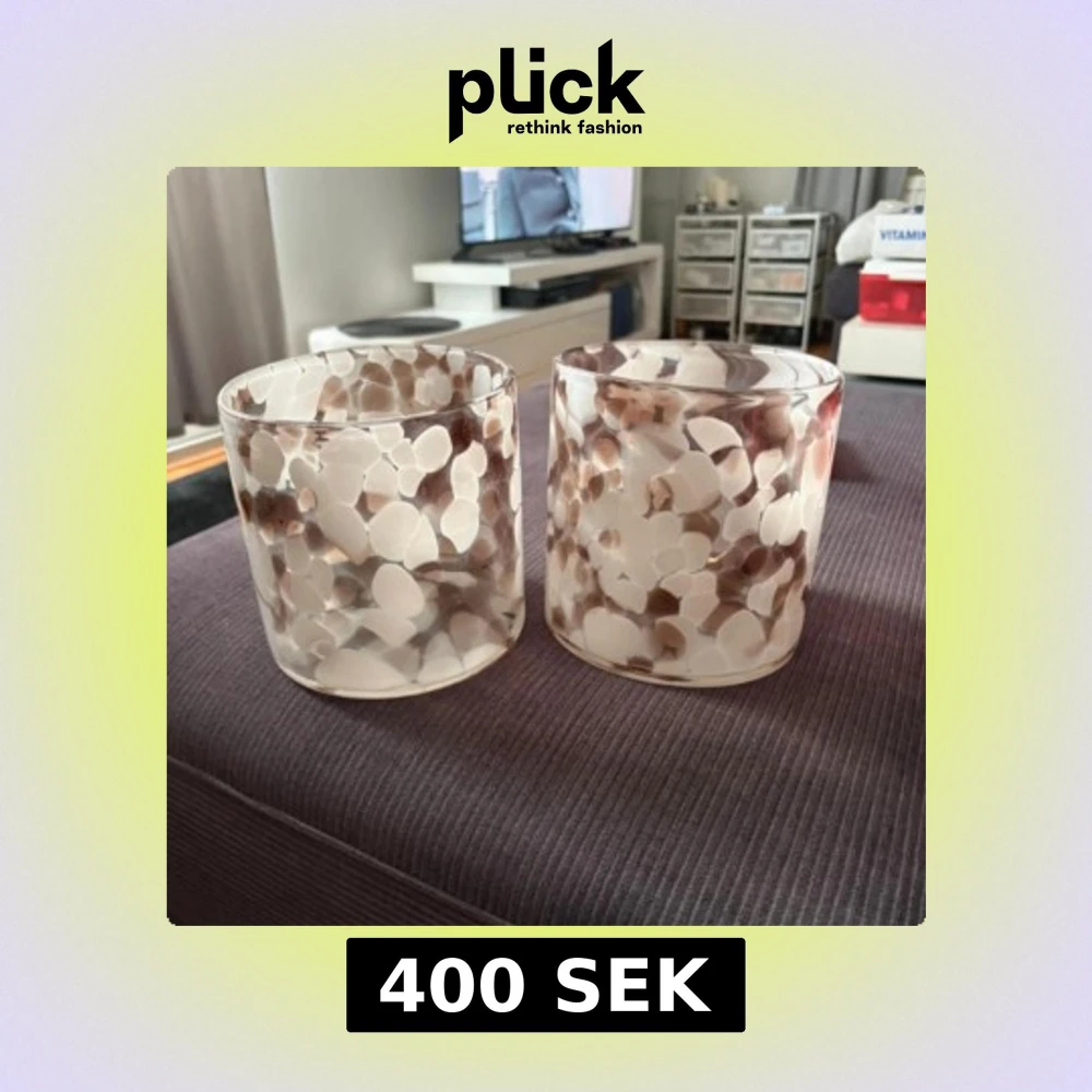 Bilden visar två glasvaser eller ljuslyktor med brunt och vitt mönster.
