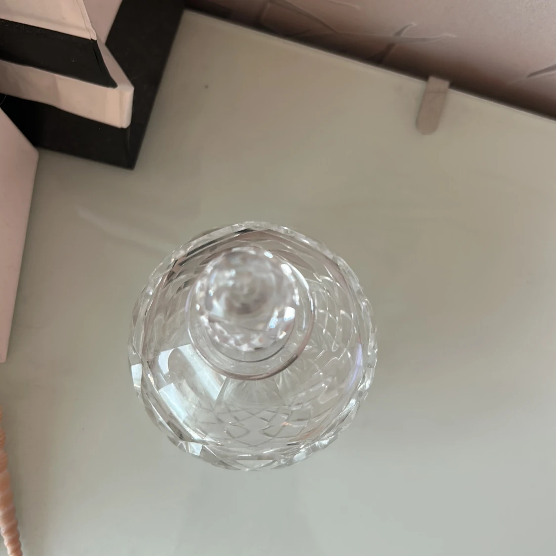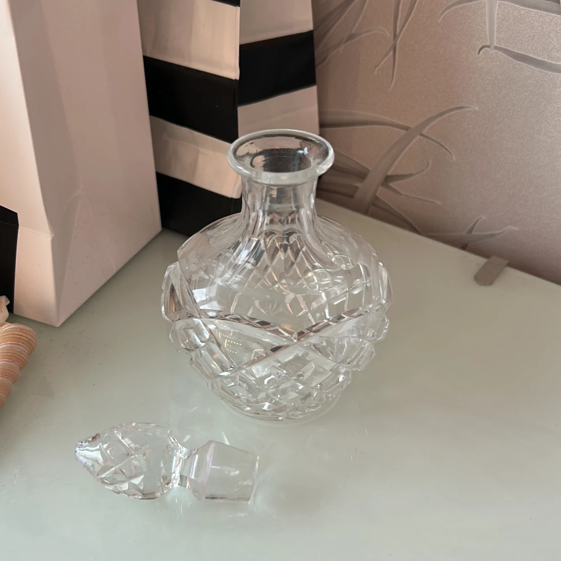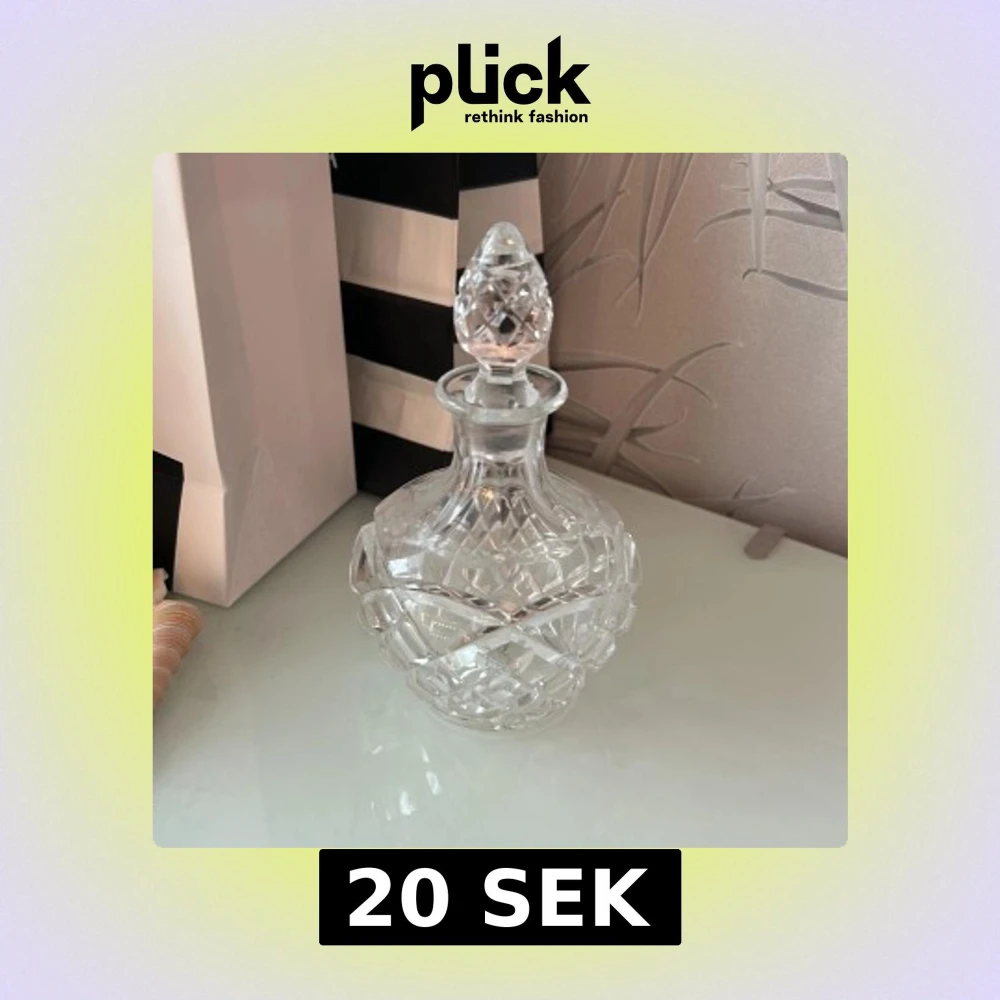 Snygg kristallflaska för parfym eller doftolja. Perfekt som dekorativt inslag på sminkbordet eller för dig som vill ha en unik behållare till din favoritdoft. Flaskan är tom och har ett elegant mönster. Volym och ursprung ej angivet.
