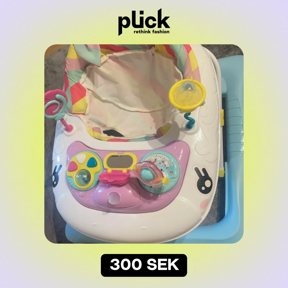 Säljer en superfin gåstol för barn i härliga pastellfärger. Den har en vit bas med en lekpanel i rosa, gul och blå med roliga leksaker och ljudfunktioner. Sitsen är mjuk och mönstrad i rosa, mintgrön och gul. Perfekt för att underhålla och stödja ditt barns första steg!