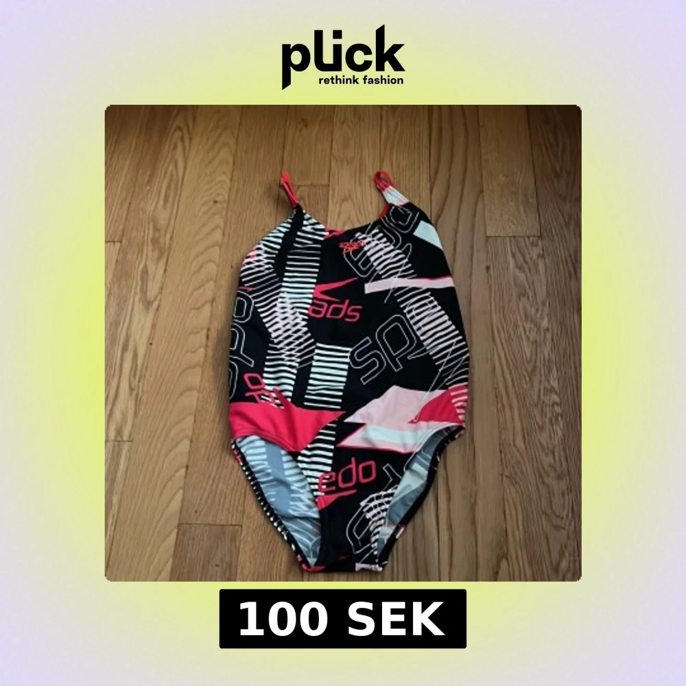 Säljer en sportig baddräkt från Speedo med svart, vit och röda mönster och tunna axelband. Perfekt för simträning eller bad. Snygg design med öppen rygg och knytning baktill.