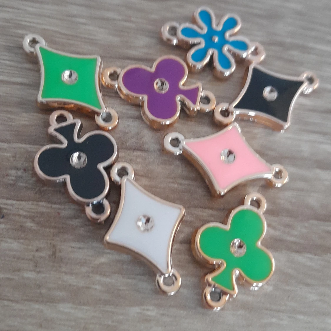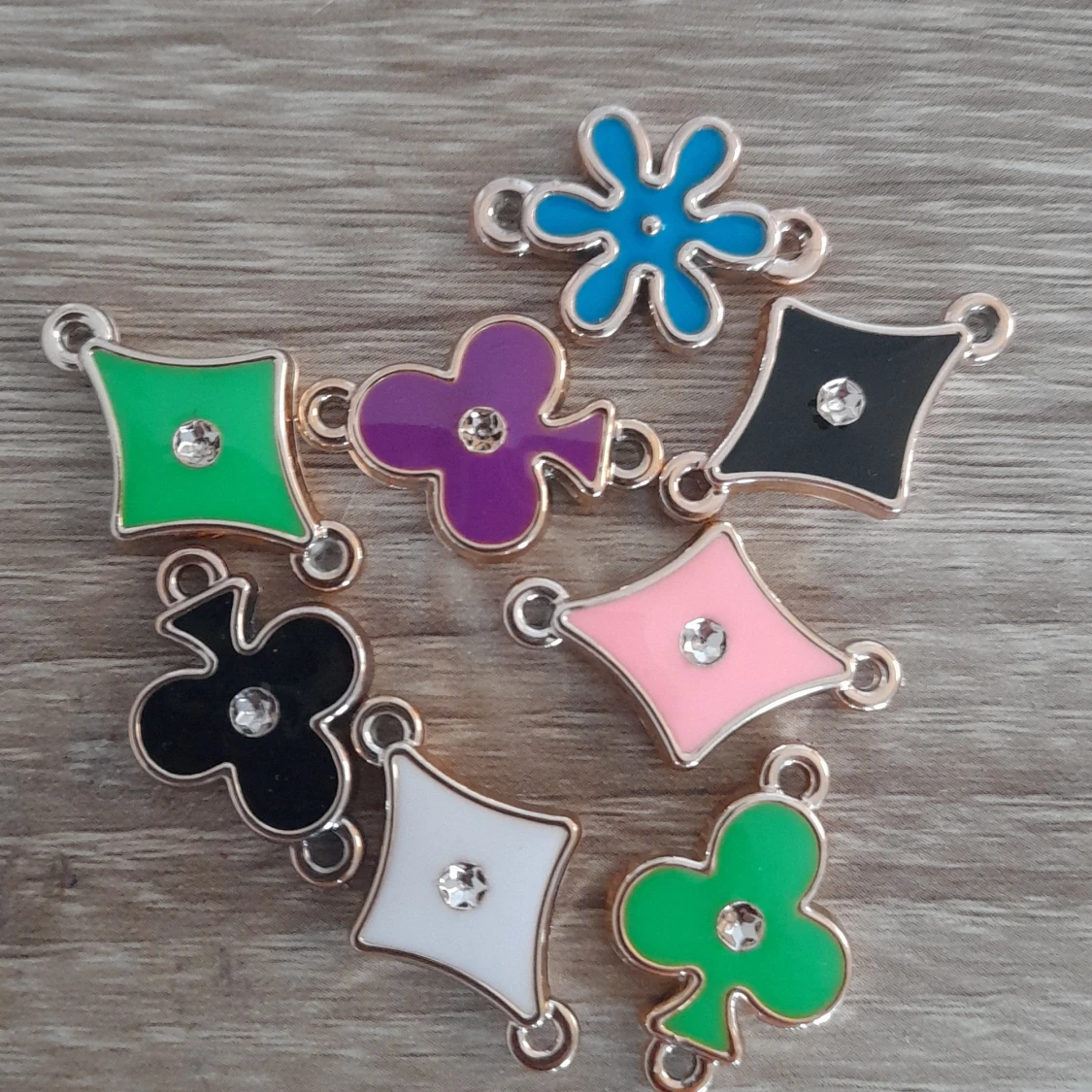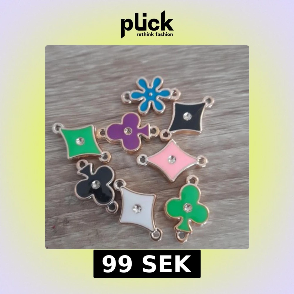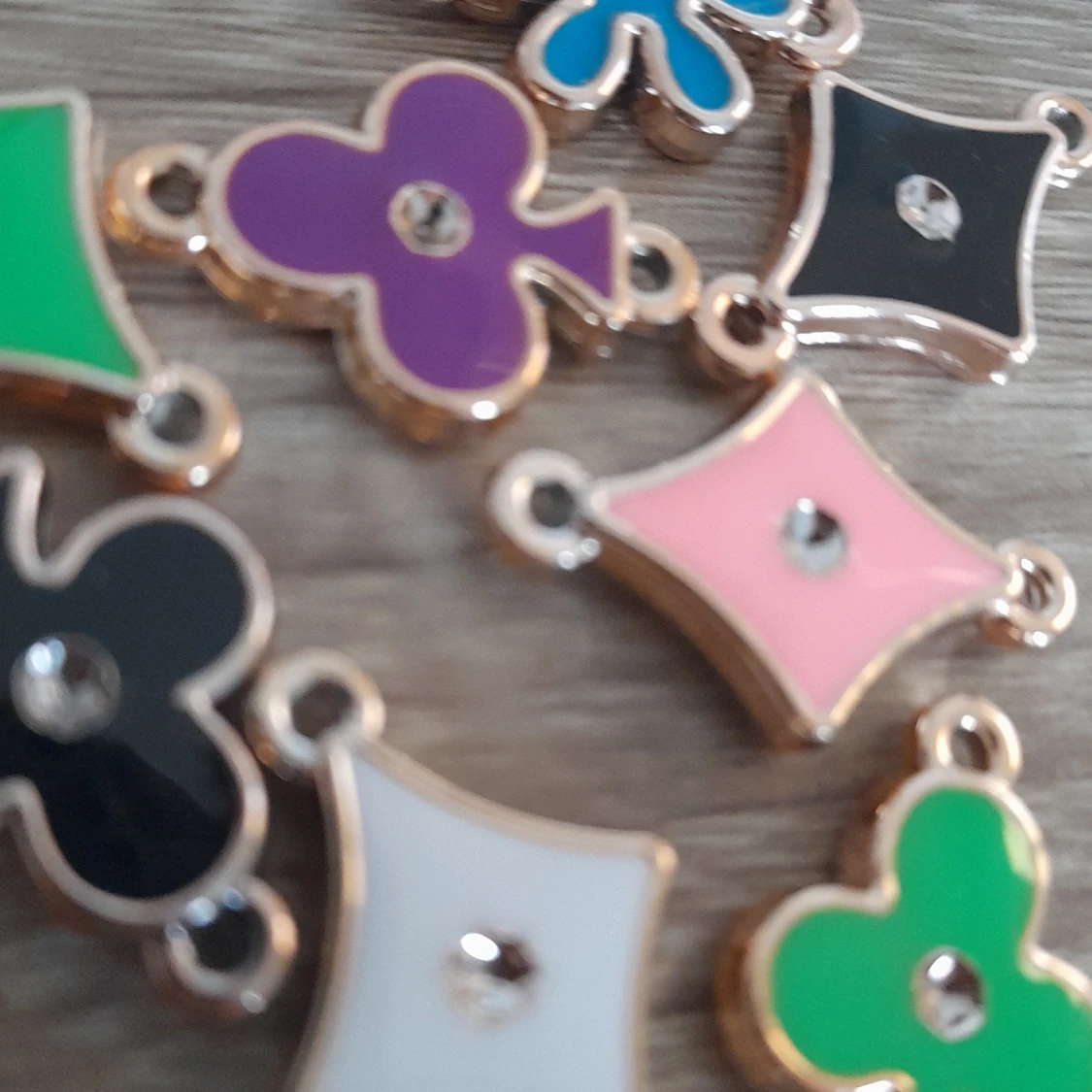 Säljer ett set med sju berlocker i olika former och färger, perfekta till armband eller halsband. Berlockerna har detaljer i guld och en liten kristall i mitten. Färgerna är blå, grön, svart, vit, rosa och lila. Formerna är inspirerade av spelkort och en blomma.