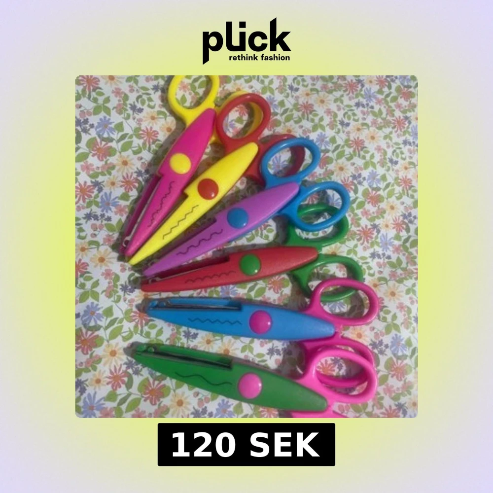 Set med 6 färgglada mönstersaxar för pyssel och scrapbooking. Varje sax har unika mönster på bladen för kreativa kanter. Passar både barn och vuxna. Saxarna är i gott skick utan synligt slitage eller defekter. Perfekt för hobbyprojekt och DIY.