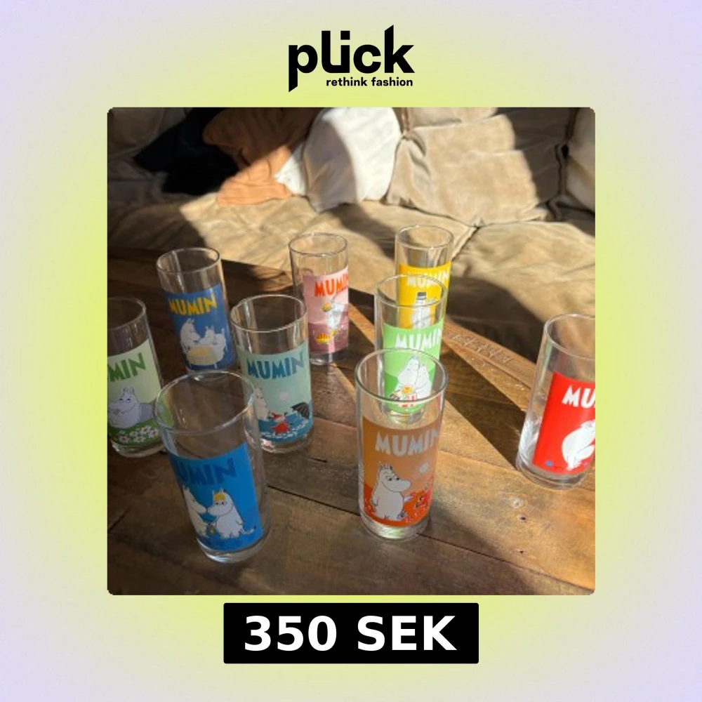 Säljer en samling av nio färgglada Mumin-glas med olika motiv och färger. Perfekta för Mumin-fans och samlare. Glasen har motiv i blått, grönt, rött, gult och orange med olika Mumin-karaktärer. En av glasen är skadade på kanten.