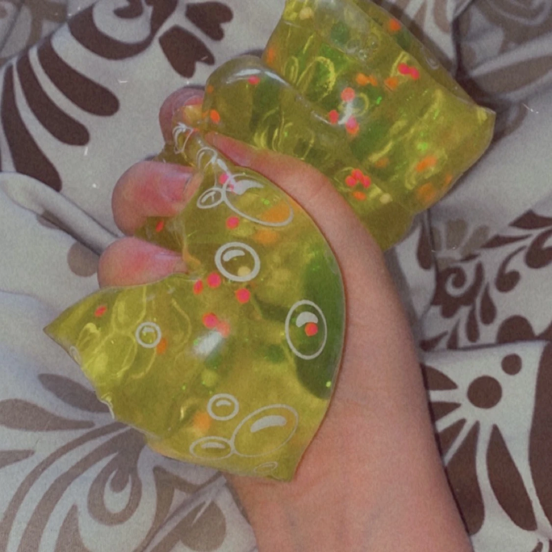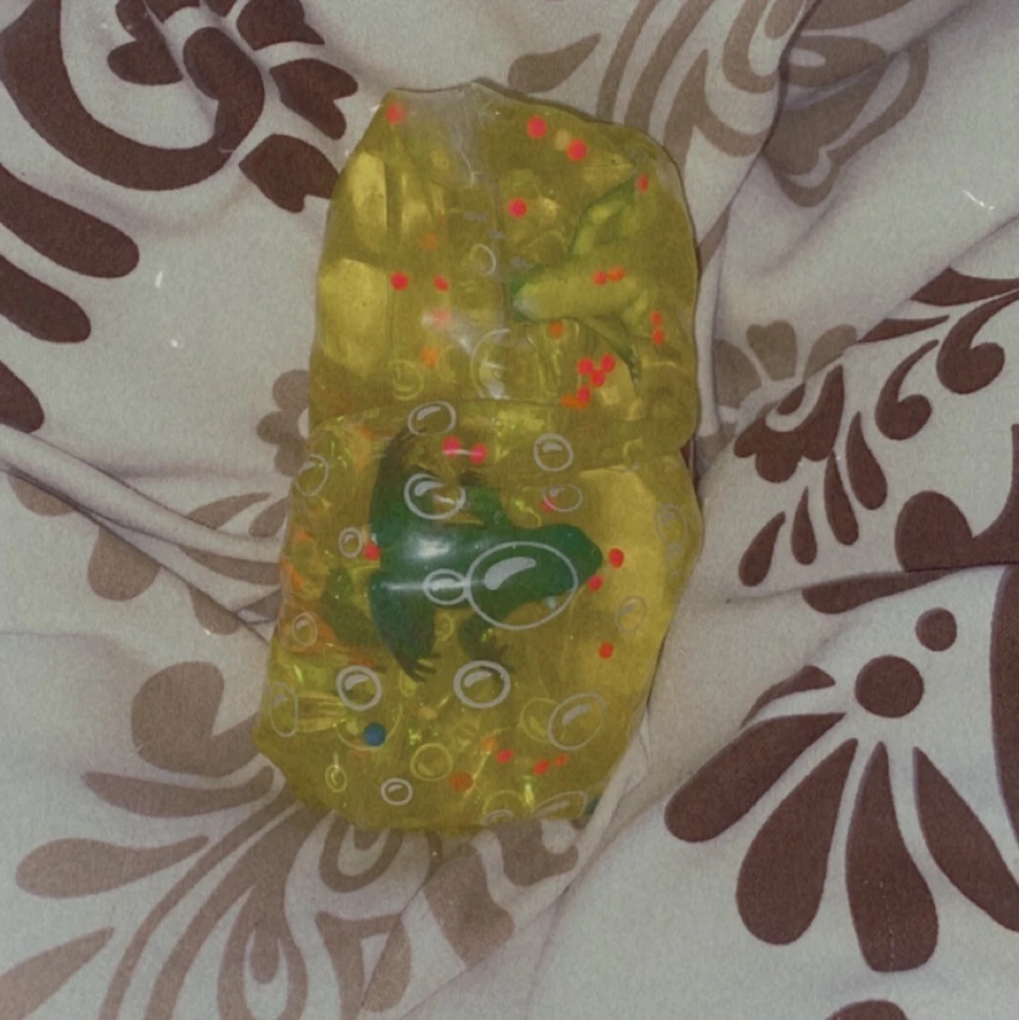 En watersnake med små grodor inuti , gul och grön färgad 💗