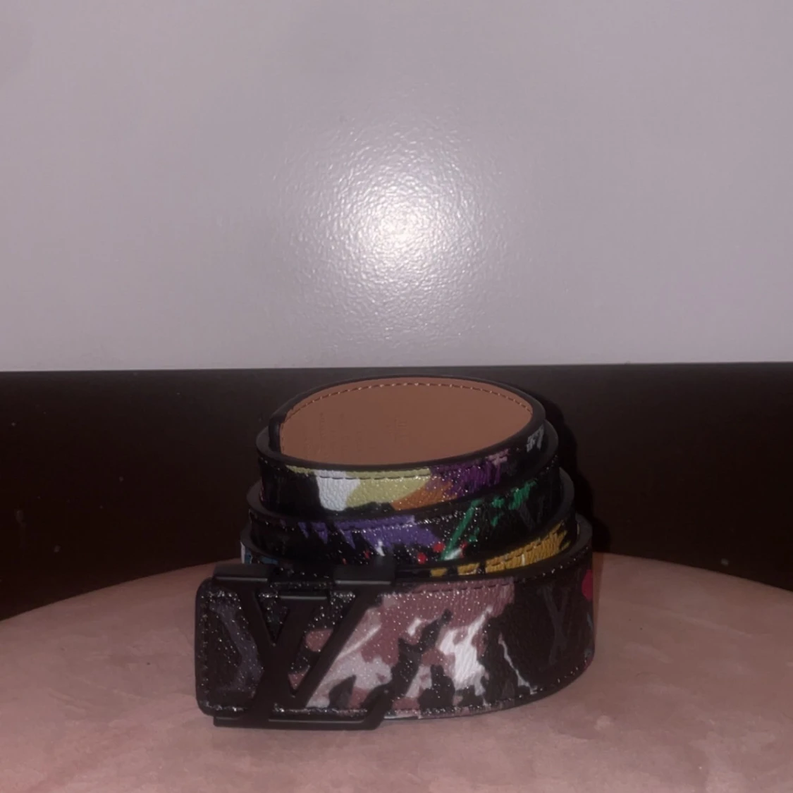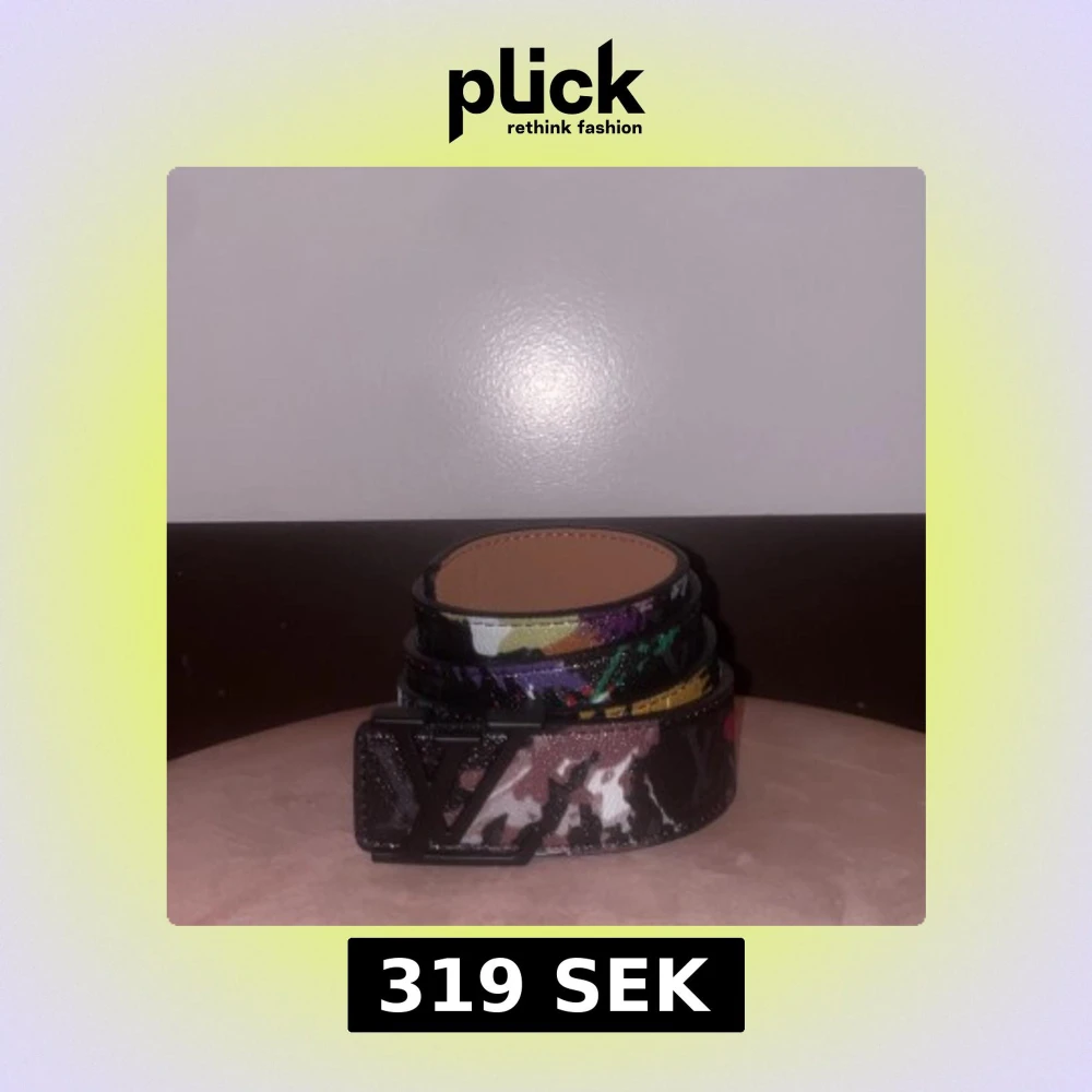 Säljer ett bälte med svart spänne och färgstarkt camouflage-mönster i svart, vitt, grönt, lila, gult och rosa. Bältet är gjort i skinn och har en exklusiv känsla med sin unika design och klassiska logga framtill. Mer bilder via dm👍