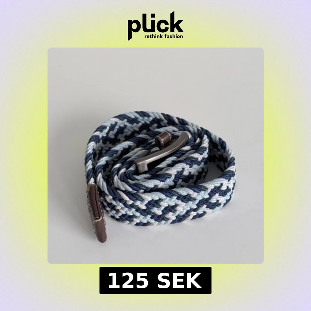 Hej! Säljer nu ett snyggt flätat bälte med randigt mönster i marinblått, ljusblått och vitt. Bältet är 110cm långt och går att justera. Köpt för 200kr från Jack & Jones. 7/10 skick.