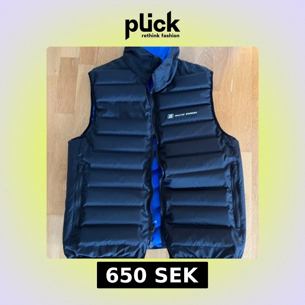Säljer en dunväst från Baltic Sweden i blått och svart med quiltad design. Västen har dragkedja framtill, ståkrage och praktiska fickor med dragkedja. Märkeslogga på bröstet och ryggen. Perfekt för dig som vill ha en sportig och snygg look. Går av vända ut och in för att byta färg. Nypris var 1250kr. Helt ny! Aldrig använd med lappen fortfarande kvar. Vikt: 70-80kg
