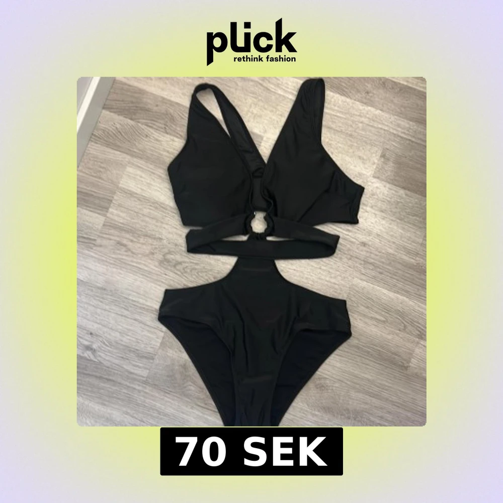 Snygg svart bikini med högt skurna trosor och trendig cut out-design. Den har breda axelband och en cool ringdetalj framtill som ger en unik look. Gjord i stretchigt syntetmaterial för bästa passform. Aldrig använd