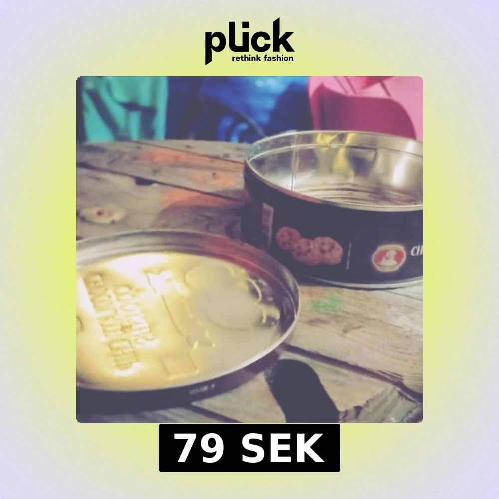 Säljer en vintage kakburk i plåt. Burken är brun med bilder av kakor och texten 'Chocolate Chip Cookies'. Perfekt för att förvara kakor eller andra godsaker. Tillverkad i Danmark.