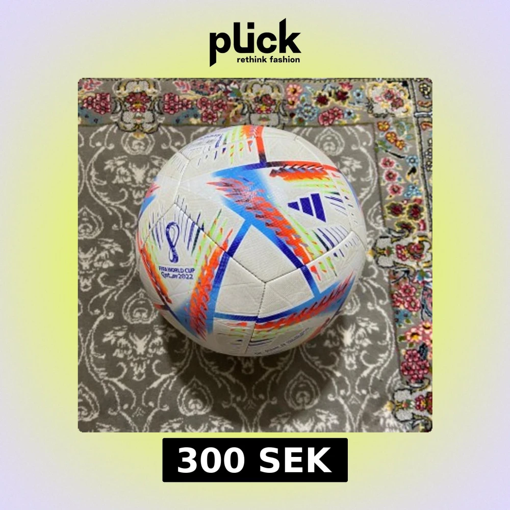 Säljer en officiell Adidas fotboll från FIFA World Cup Qatar 2022. Bollen är vit med färgglada detaljer i blått, rött, orange och grönt. Den har ett modernt grafiskt mönster och FIFA-logga tryckt på sidan. Perfekt för matcher eller träning.
