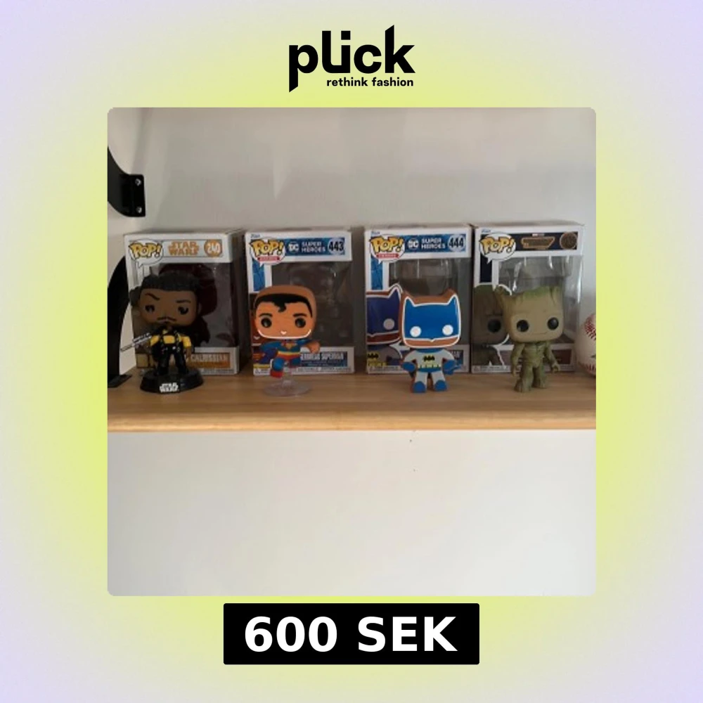 En samling av Funko Pop! figurer inklusive karaktärer från Star Wars, DC Super Heroes och Marvel. Figurerna inkluderar Lando Calrissian, Superman, Batman och Groot. Perfekt för samlare eller som dekoration i hemmet.