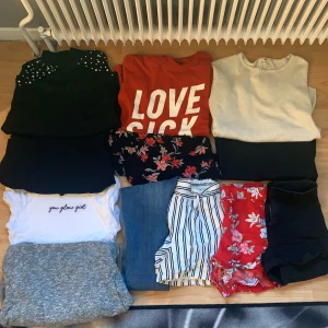 Kläder från bland annat Gina tricot, HM och Zara. Ett par jeans, 3 par shorts, 2 t-shits, 4 långärmade, en mysig hoddie och ett sommar linne. Kläderna är i bra skick💞