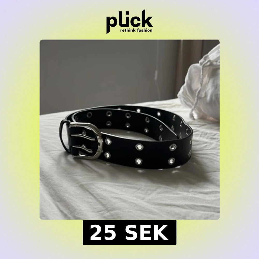 Säljer ett svart bälte med dubbla rader av silverfärgade hål och ett stort silverspänne. Bältet har en cool och edgy stil, perfekt för att lyfta vilken outfit som helst.
