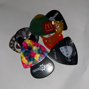 6 St plektrum från gear4music och rockon samt 3 egengjorda plektrum från gamla presentkort. Alla plektrumen som är köpta från fysiska butiker är i storlek 0,71mm. 🟢 alla plektrum finns kvar förutom hjärtplektrumet som är sålt.