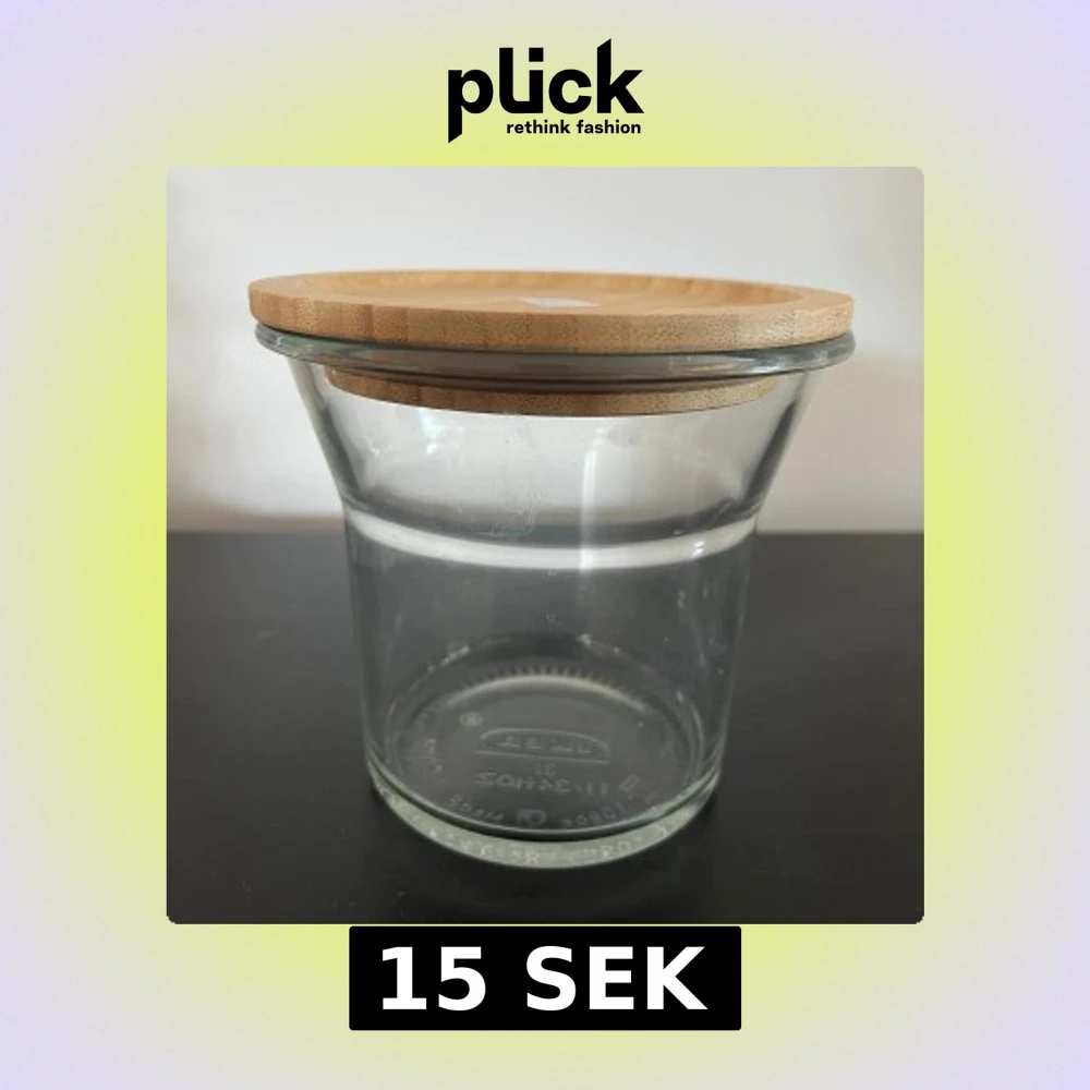Glasburk med trälock. Höjd: 14cm, diameter 14cm.