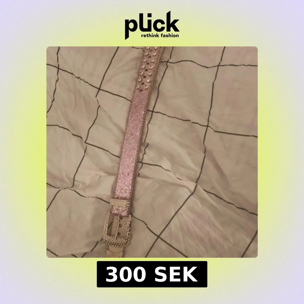 Säljer ett glittrigt rosa bälte dekorerat med silverfärgade nitar och strassdetaljer. Bältet har en rektangulär spänne med liknande dekorationer. Perfekt för att ge en extra touch till din outfit!