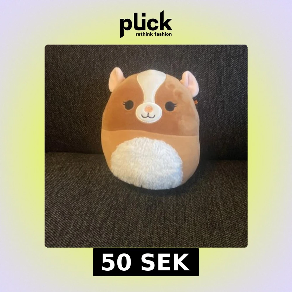 Bilderna visar ett mjukisdjur i form av en hamster, troligen en Squishmallow. Produkten är mjuk, rund och har ett sött ansikte. Inga synliga elektronikfunktioner eller märken relaterade till elektronik. Produkten verkar vara i gott skick utan synliga defekter.