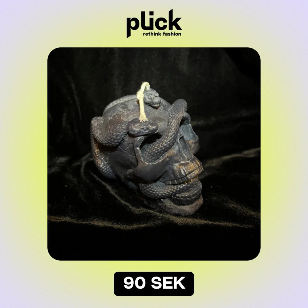 Unikt svart ljus av återvunnet stearin, format som en dödskalle med en detaljerad orm som slingrar sig runt.
