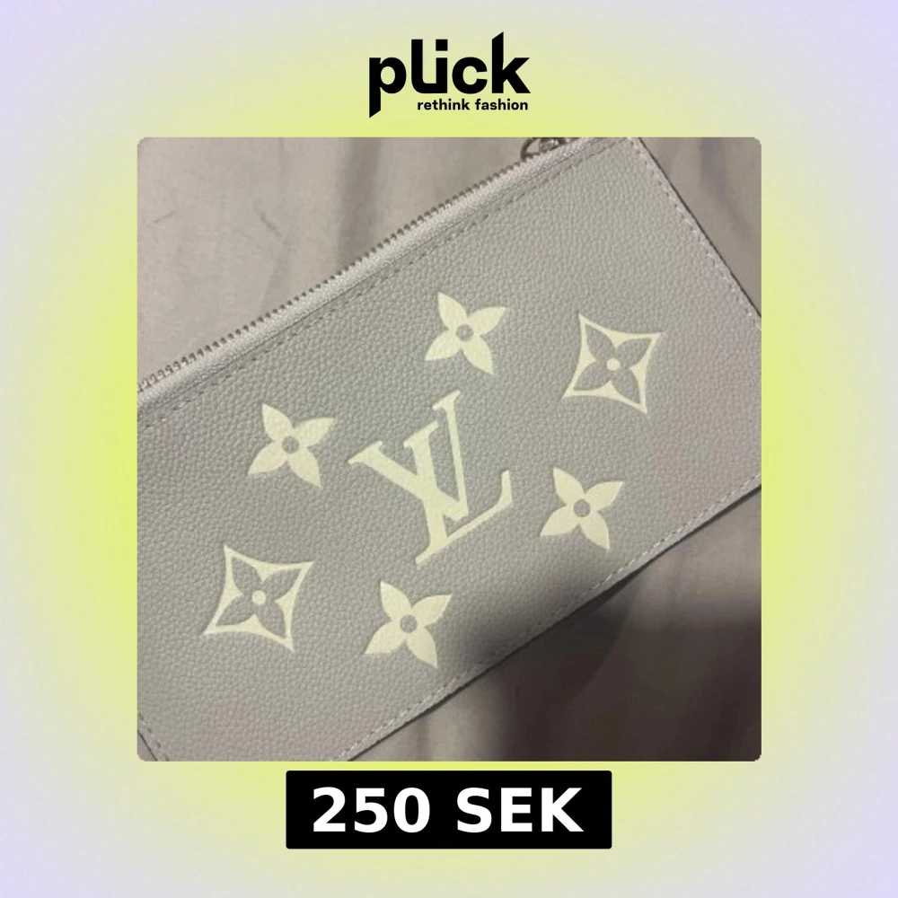 Säljer en stilren grå kuvertväska med klassiskt monogramtryck i vitt. Väskan har dragkedja upptill och är tillverkad i ett strukturerat material som ger en lyxig känsla. Perfekt att bära till alla tillfällen.