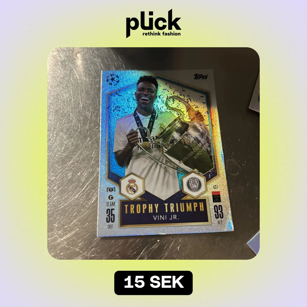 Säljer ett coolt fotbollskort från Topps med Vini Jr. i fokus. Kortet har en glittrig yta och visar Vini Jr. med en stor trofé. Perfekt för samlare av fotbollskort eller fans av Real Madrid. Kortet har detaljer som klubbens emblem och spelarens statistik.