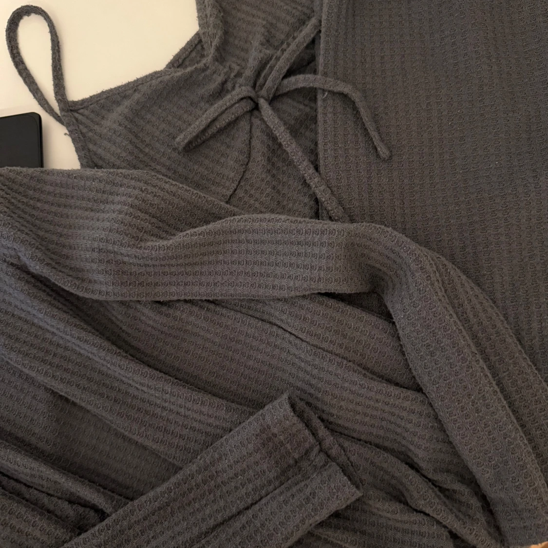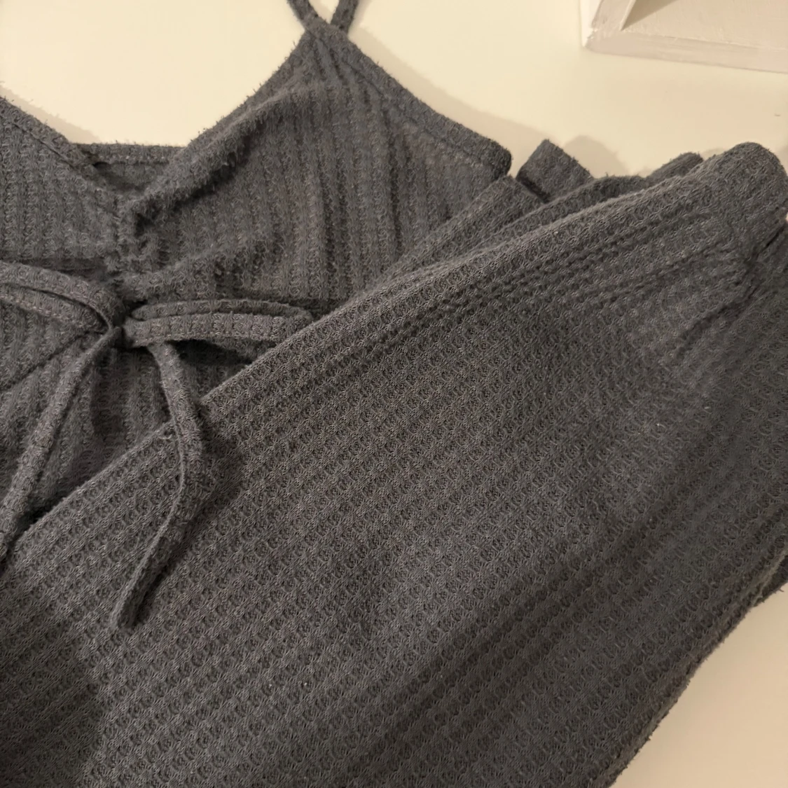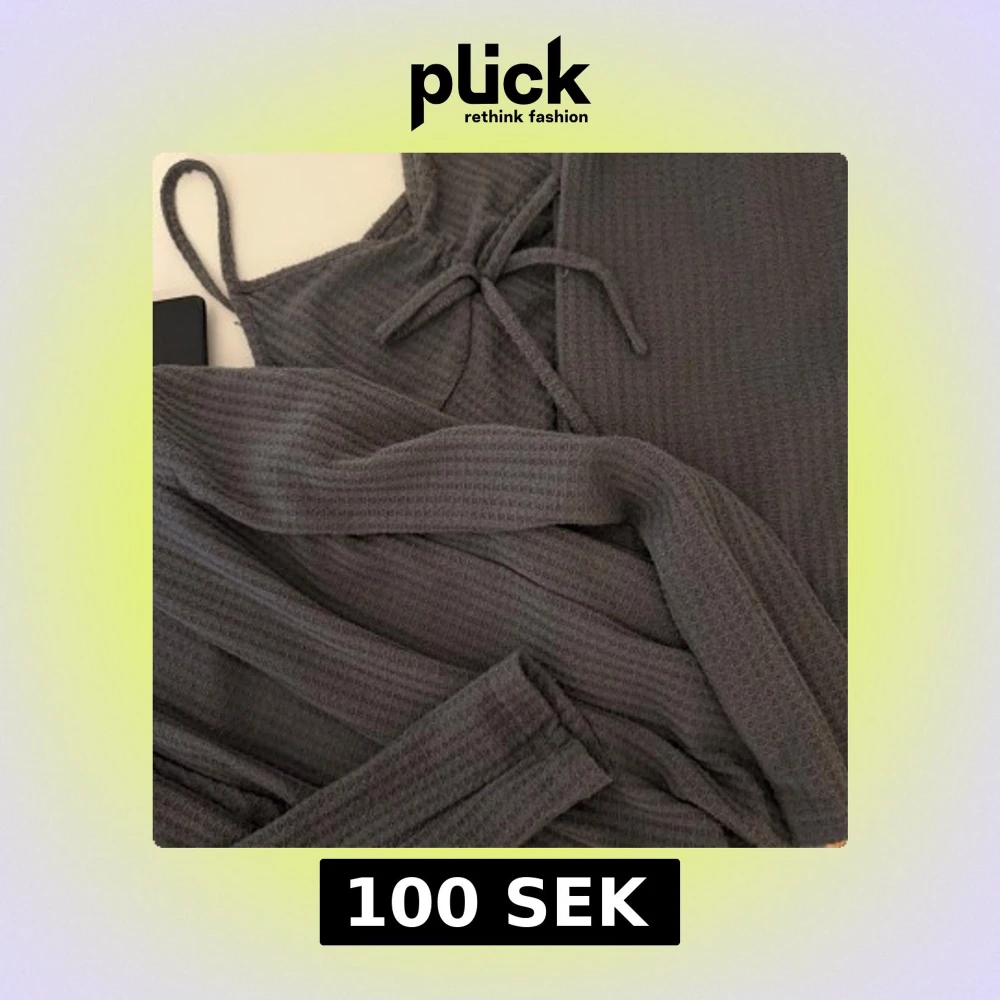Supersnyggt pyjamas sätt med ribbad struktur. I sättet ingår ett bar byxor med botcutt modell, en lång matchande kofta och ett linne. Tröjan har smala axelband och ett knyt framtill som ger en cool detalj. Materialet är mjukt och känns skönt mot huden, perfekt för dig som gillar enkel men trendig stil.