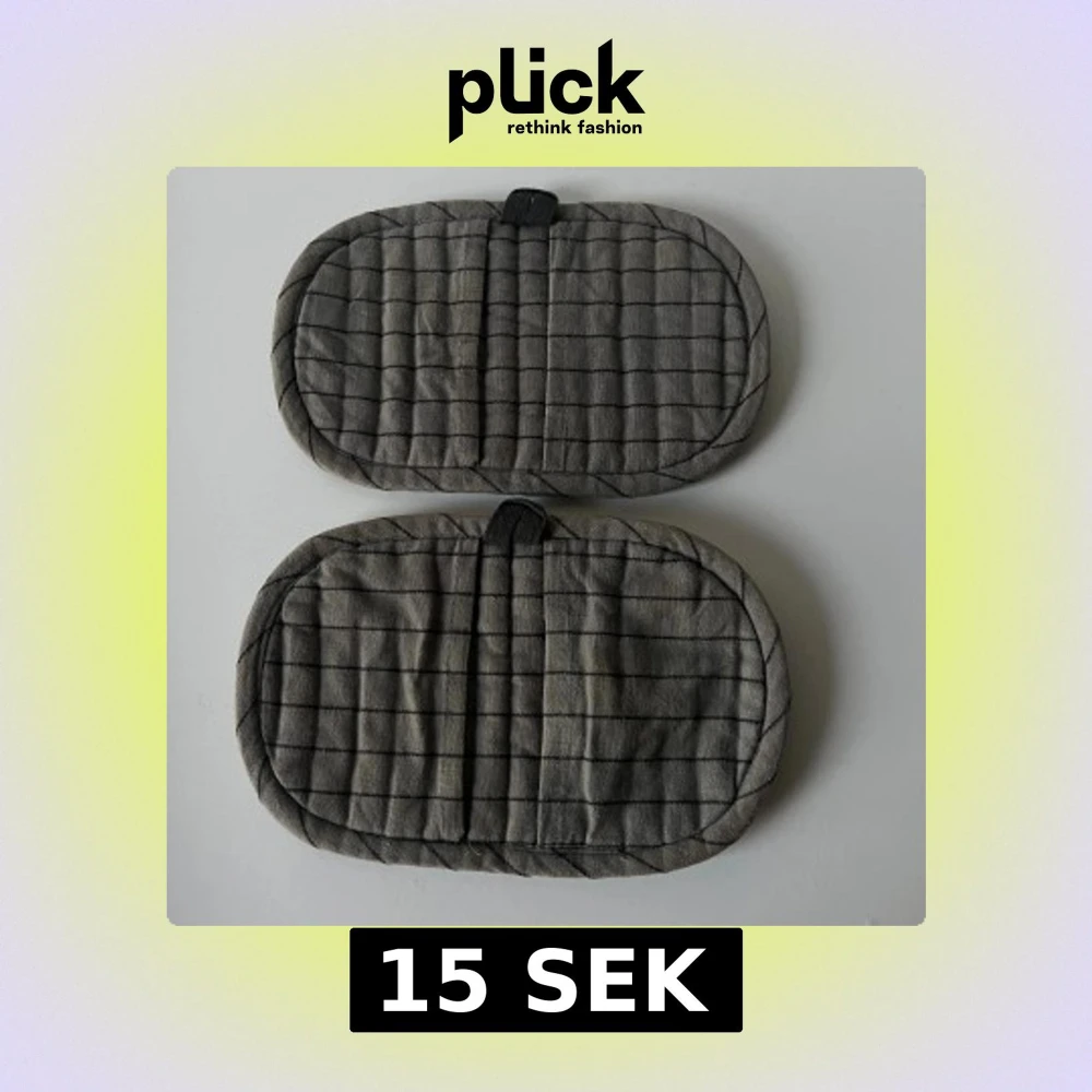 Säljer ett par gråa grytvantar med svart rutmönster. De är rektangulära med rundade kanter och har en liten svart ögla för upphängning.