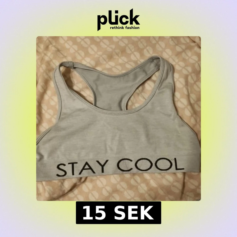 Säljer en grå sporttopp från Lindex med texten 'STAY COOL' i svart. Toppen har en racerback-design och är tillverkad i ett mjukt och stretchigt material för optimal komfort.