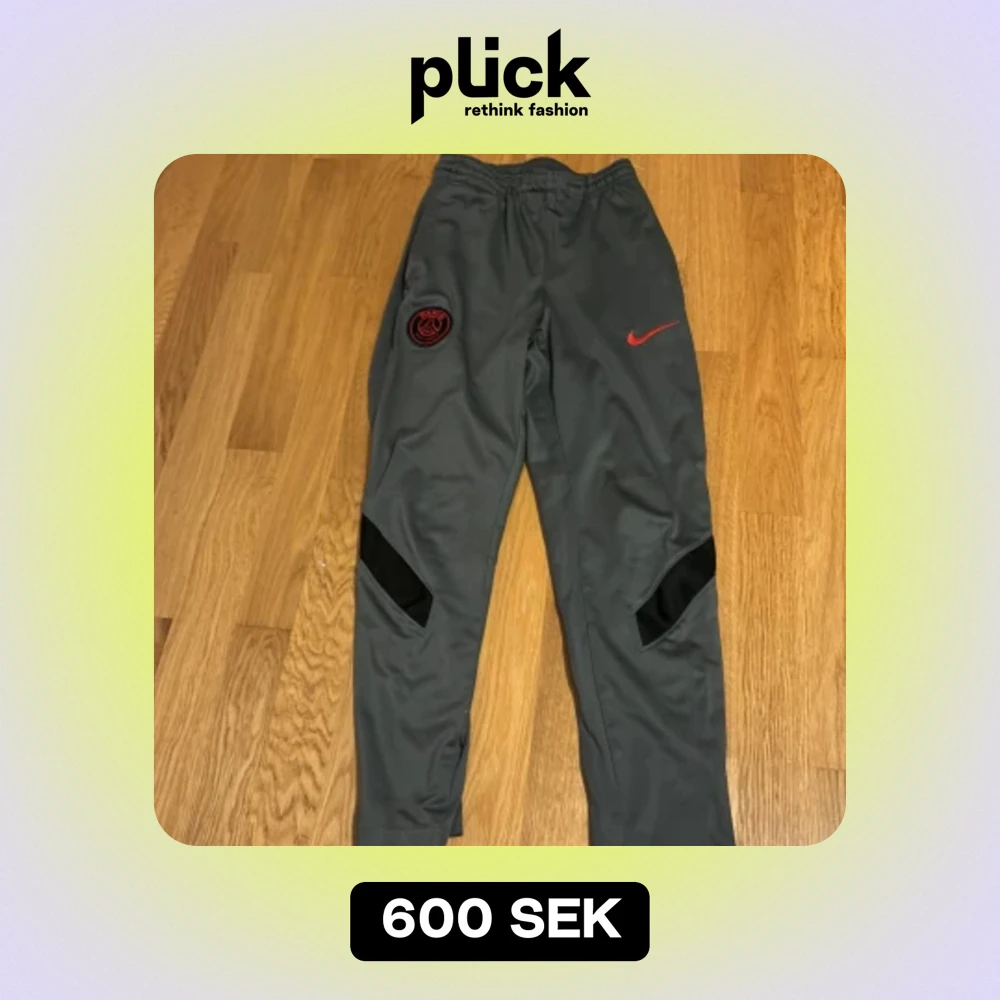 Säljer ett grått träningsset från Nike med PSG-logga. Setet består av en jacka med dragkedja och matchande byxor. Både jackan och byxorna har röda Nike-loggor och svarta detaljer. Perfekt för träning eller vardagsbruk!