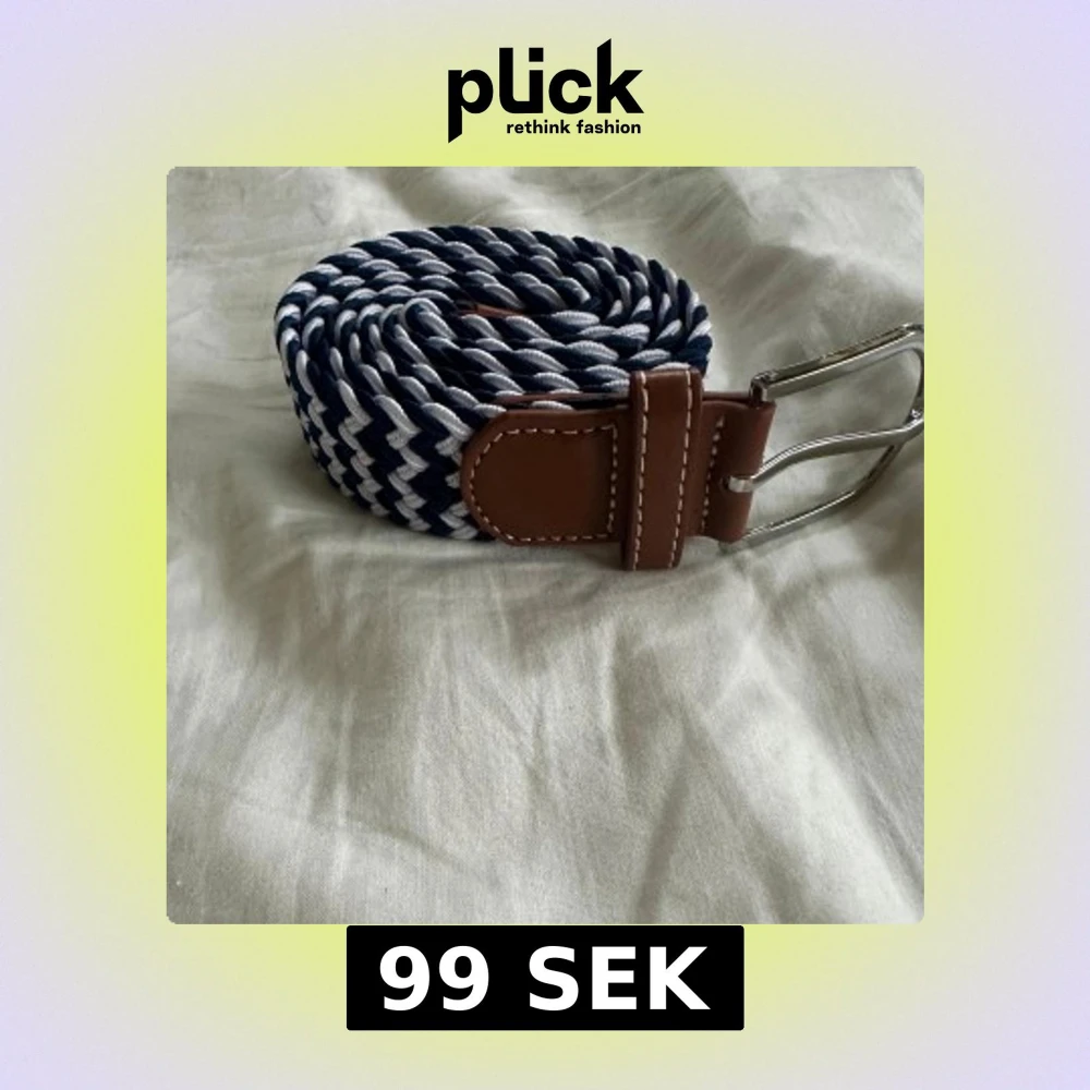 Snyggt flätat bälte med randigt mönster i marinblått och vitt. Bältet har bruna skinn-detaljer vid ändarna och ett silvrigt metallspänne. Perfekt för att ge din outfit en cool och fräsch touch. Passar till jeans, chinos eller shorts.