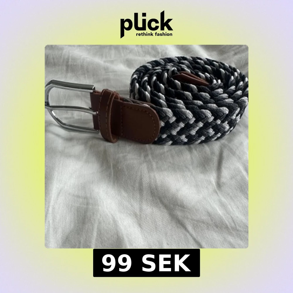 Snyggt flätat bälte i svart, vitt och grå med bruna skinn-detaljer vid spännet och änden. Bältet har ett coolt randigt mönster och ett silvrigt metallspänne som ger en modern vibe.
