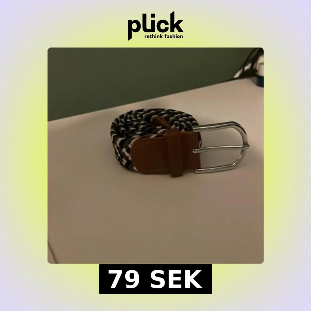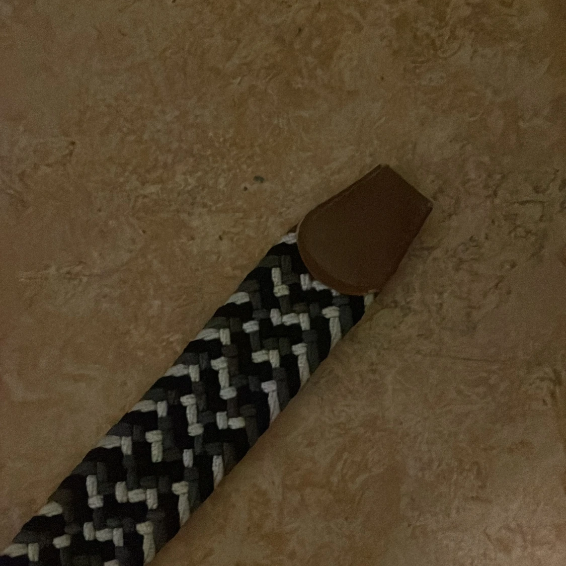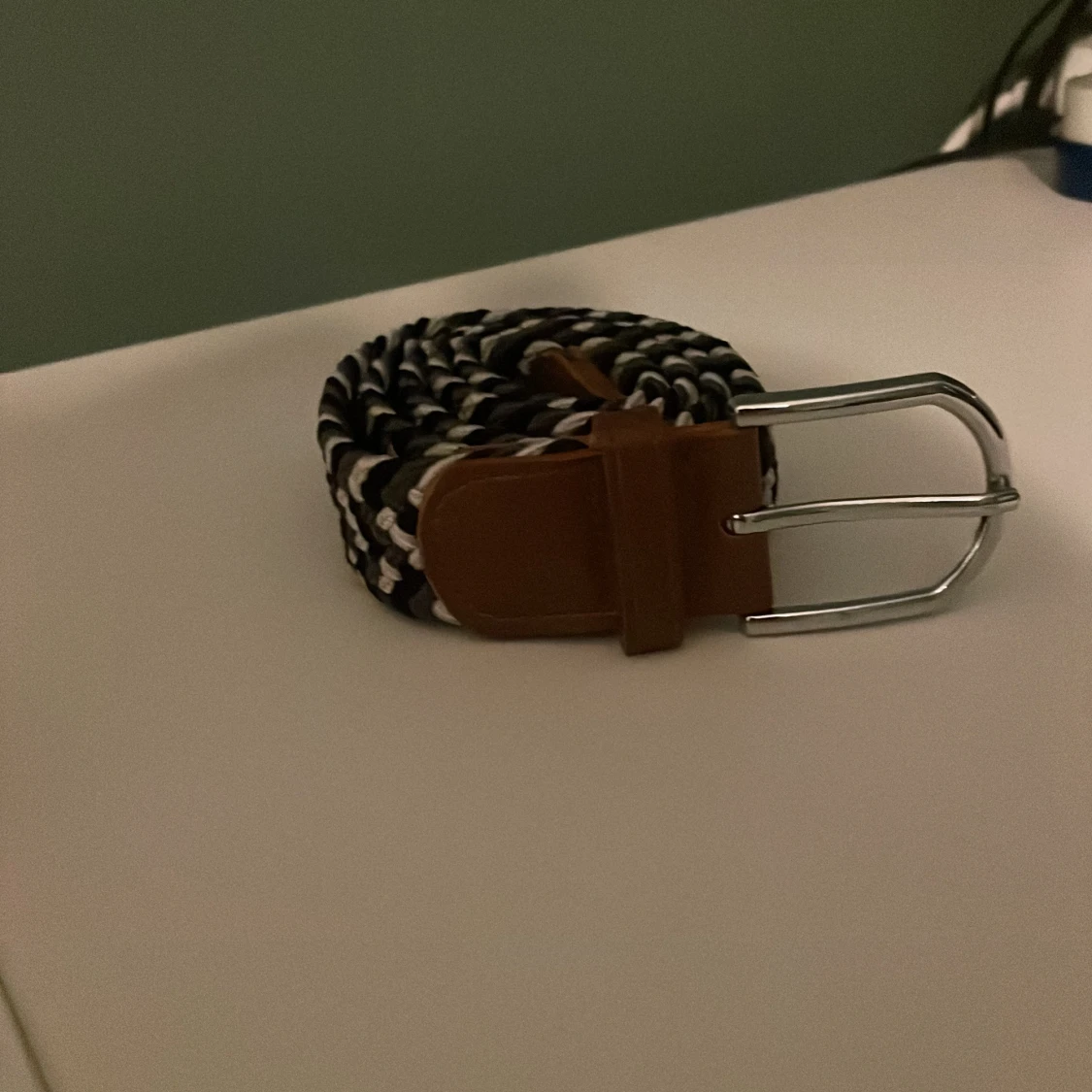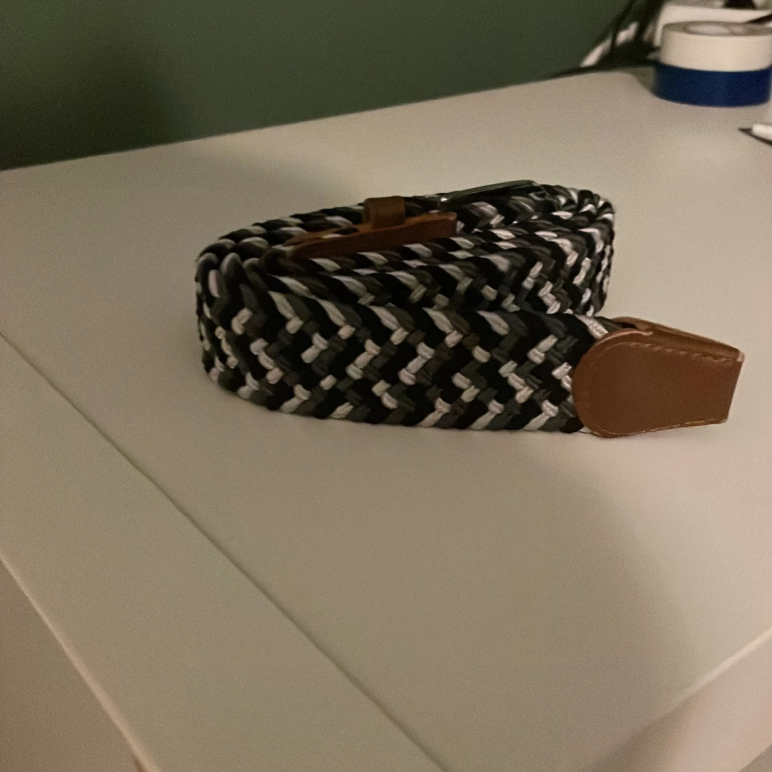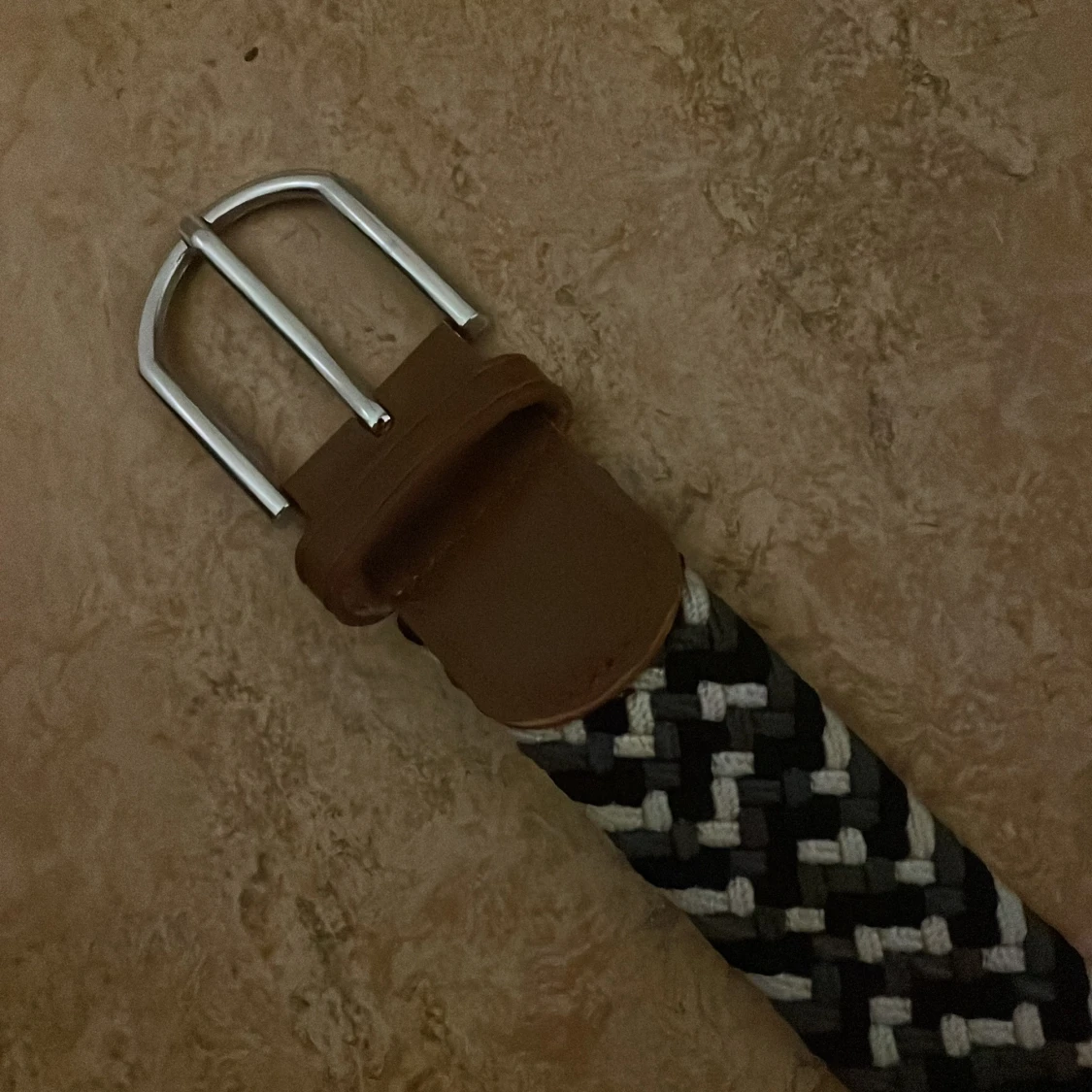 Snyggt flätat bälte i svart, grå och vitt med bruna läderdetaljer. Bältet har ett silverfärgat spänne och passar perfekt för att ge en stilren touch till din outfit.
