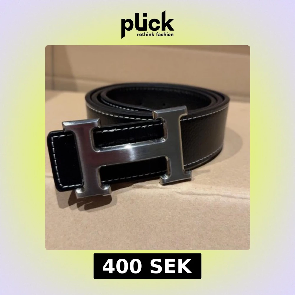 Snyggt svart bälte med ett ikoniskt H-format metallspänne i silver med vit kontrastsöm längs kanterna, vilket ger en stilren och lyxig känsla. Perfekt accessoar för att lyfta din outfit