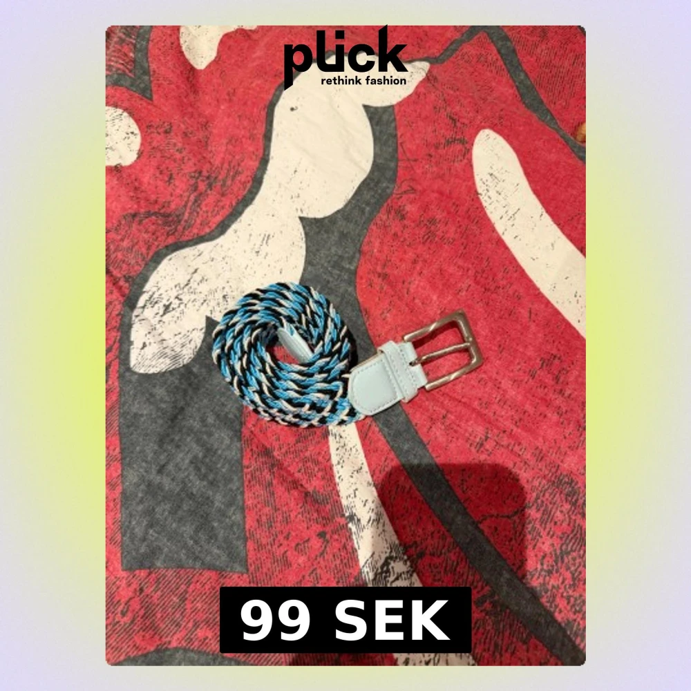 Snyggt flätat bälte från Wan Hao med randigt mönster i blått, svart och vitt. Spännet och ändarna är i ljusblått syntetmaterial och metall. Perfekt accessoar för att ge din outfit en färgklick och cool känsla.