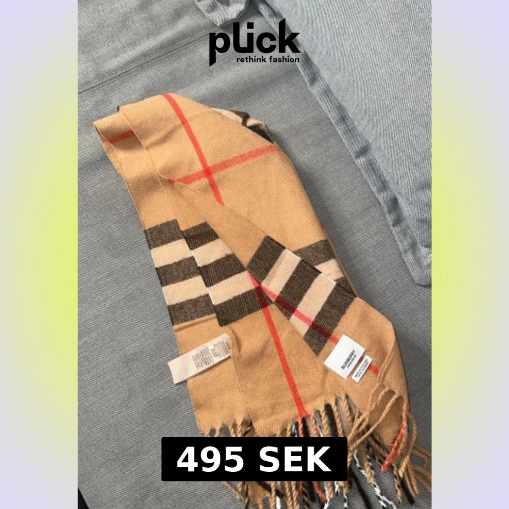 Snygg klassisk halsduk från Burberry i 100% kashmir. Beige botten med rutigt mönster i svart, vitt och rött. Mjukt material och fransar i ändarna. Perfekt accessoar för att lyfta din outfit med lyxig känsla och ikonisk design.
