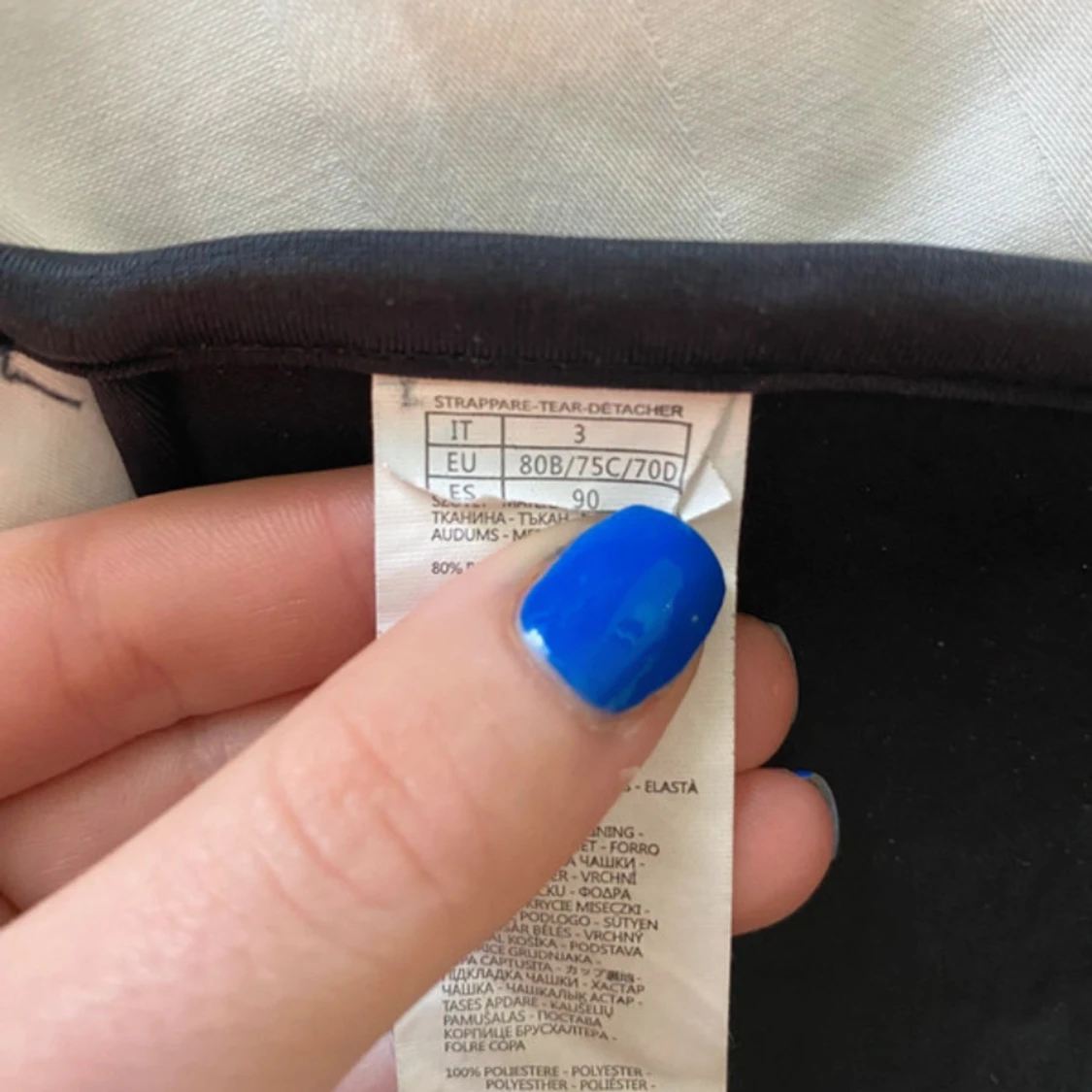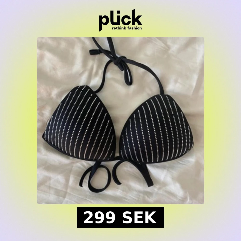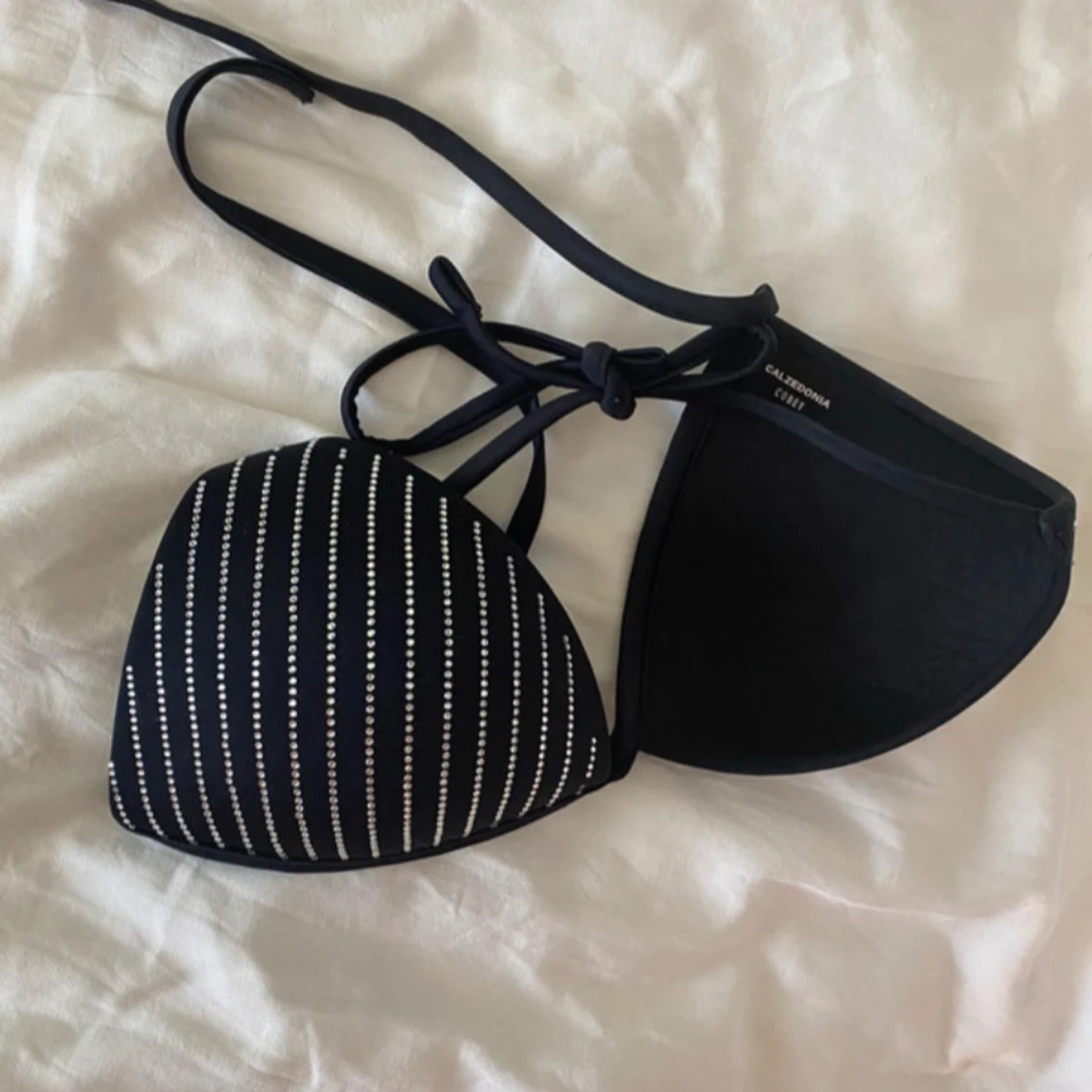 Snygg svart bikiniöverdel från Calzedonia med tunna vita ränder av små glittriga stenar. Klassisk trekantsmodell med knyt i nacke och rygg. Tillverkad i stretchigt material som sitter skönt och formar sig efter kroppen. Perfekt för strandhäng och poolparty!