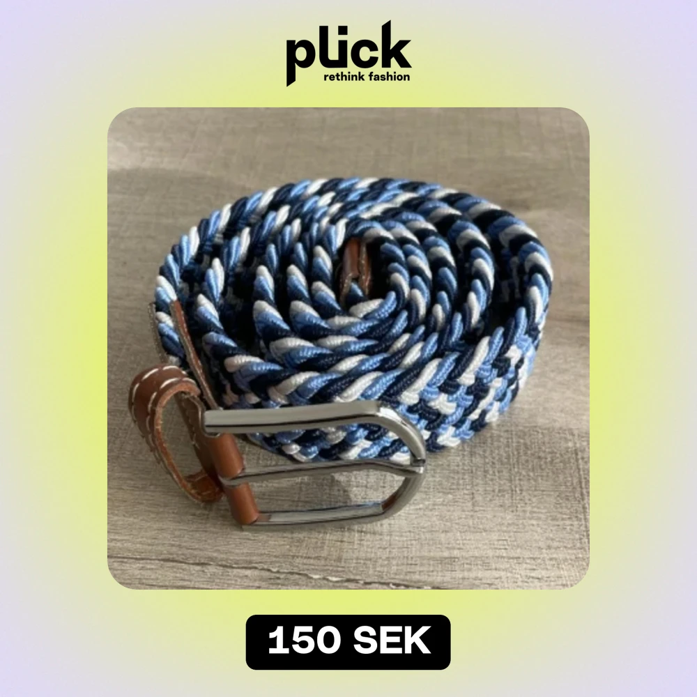 Flätat bälte från Onewear - Säljer ett snyggt flätat bälte från Onewear i olika blå nyanser med inslag av beige. Bältet har silverfärgat spänne och detaljer i mörkblått skinn. Perfekt accessoar för att lyfta din outfit. Helt nytt, aldrig använt därför att jag köpte en för liten storlek, har till och med lappen kvar.