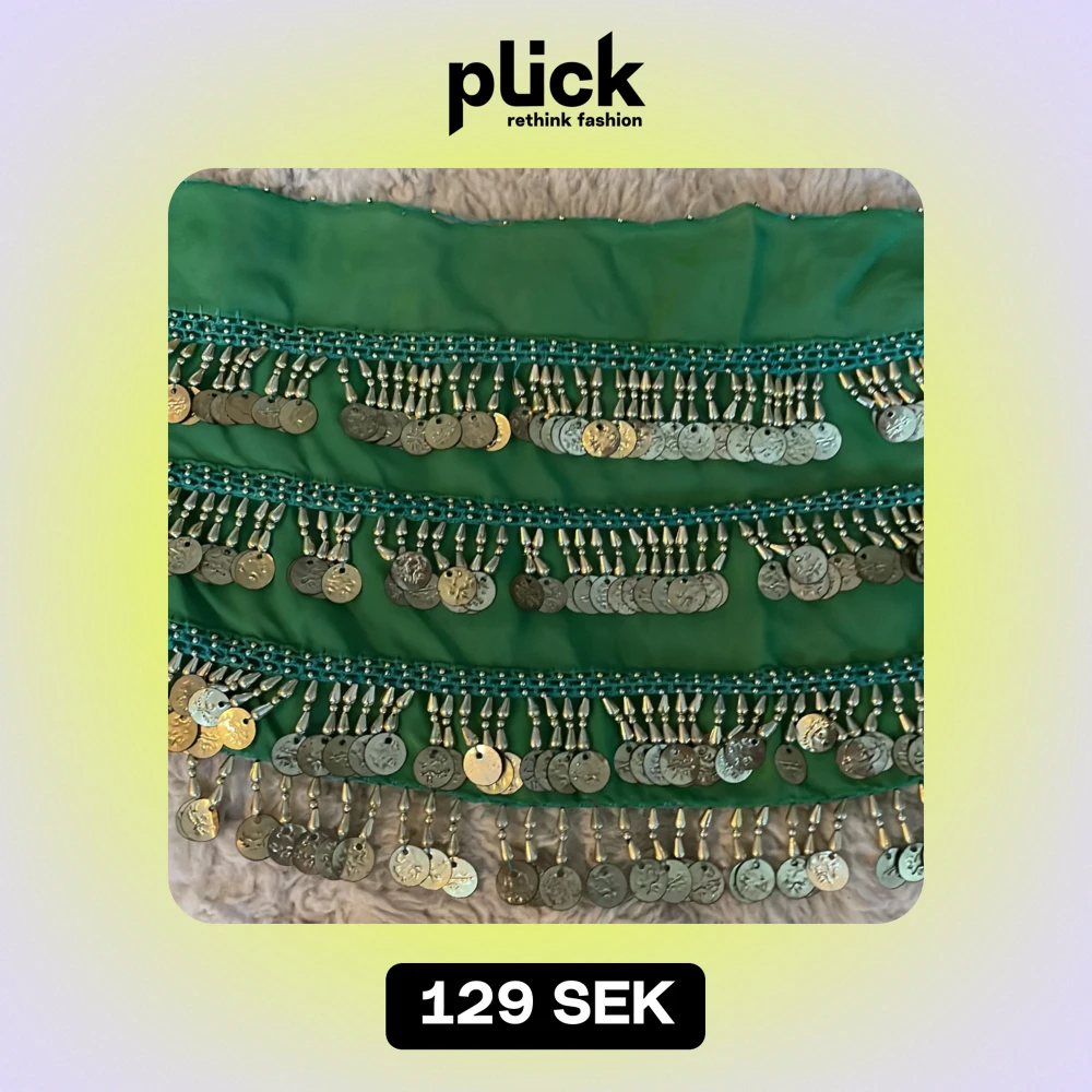 Säljer en grön danssjal dekorerad med silverfärgade mynt som ger ett härligt ljud när man rör sig. Perfekt för festliga tillfällen eller dansuppvisningar. Sjalen är i ett lätt och luftigt material som faller fint.