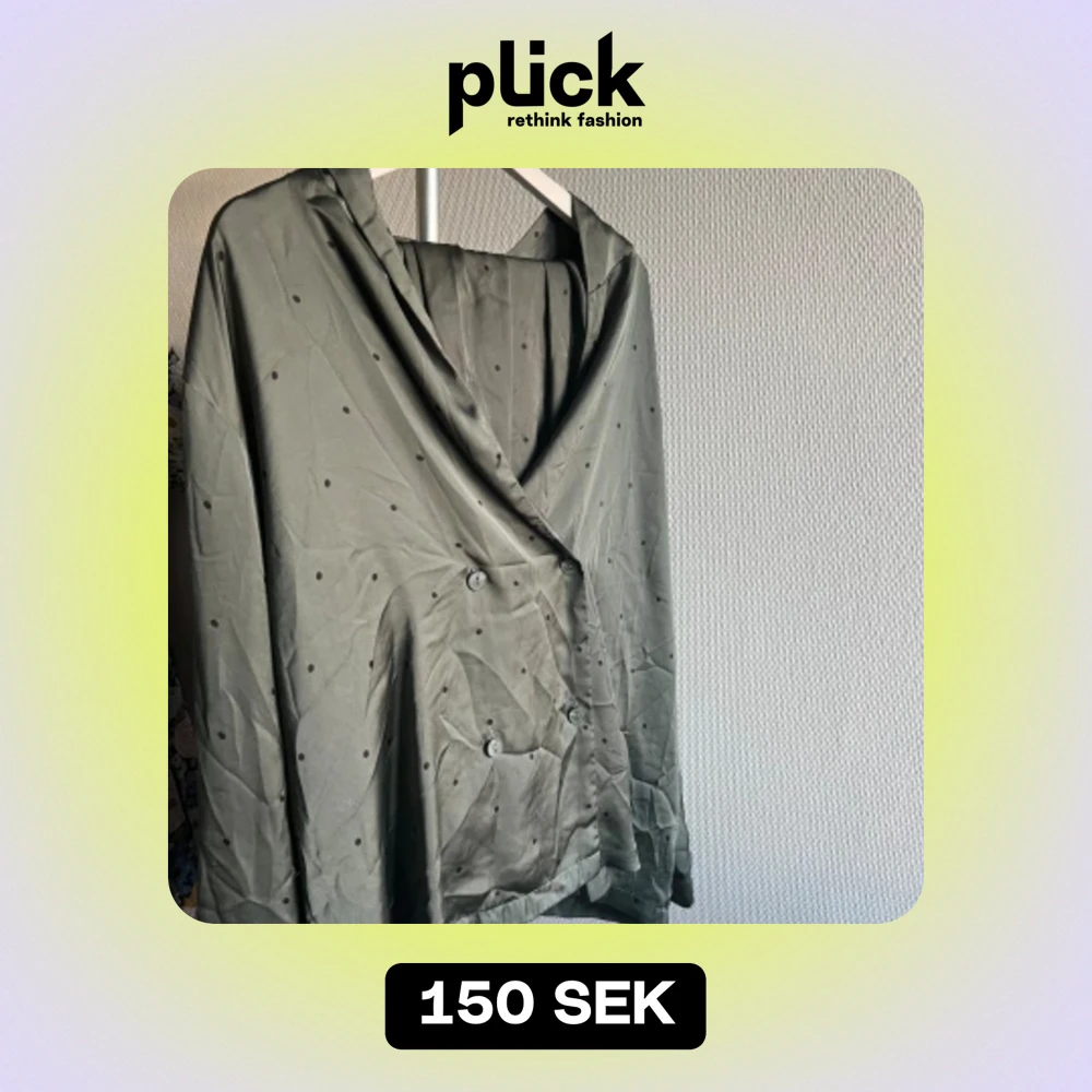 Säljer en snygg gröngrå silke pyjamas med små prickar. pyjamaseb har en lös passform och är långärmad. Den är tillverkad i ett syntetmaterial som ger en lätt och bekväm känsla.