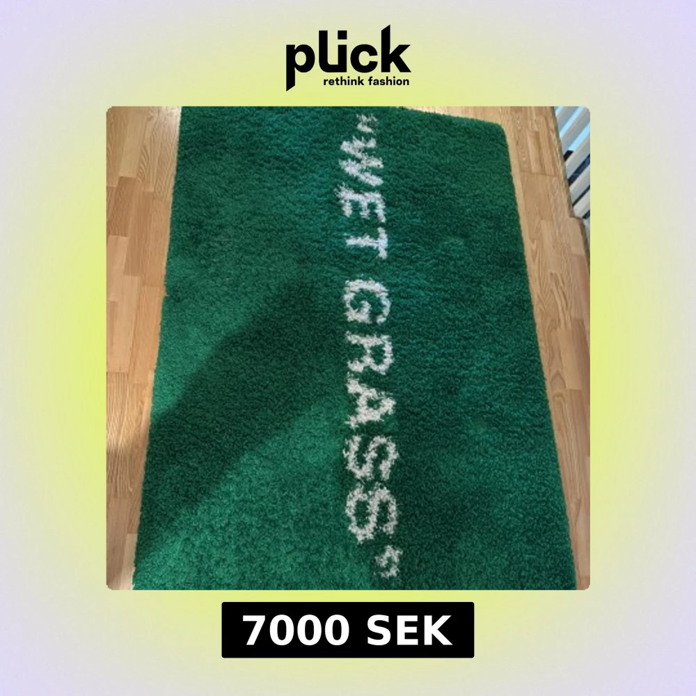 Säljer en unik grön matta från IKEA designad av Virgil Abloh. Mattan har texten 'WET GRASS' i vitt och är en del av kollektionen 'Flooring' från 2019. Perfekt för att ge ditt rum en modern och konstnärlig touch.