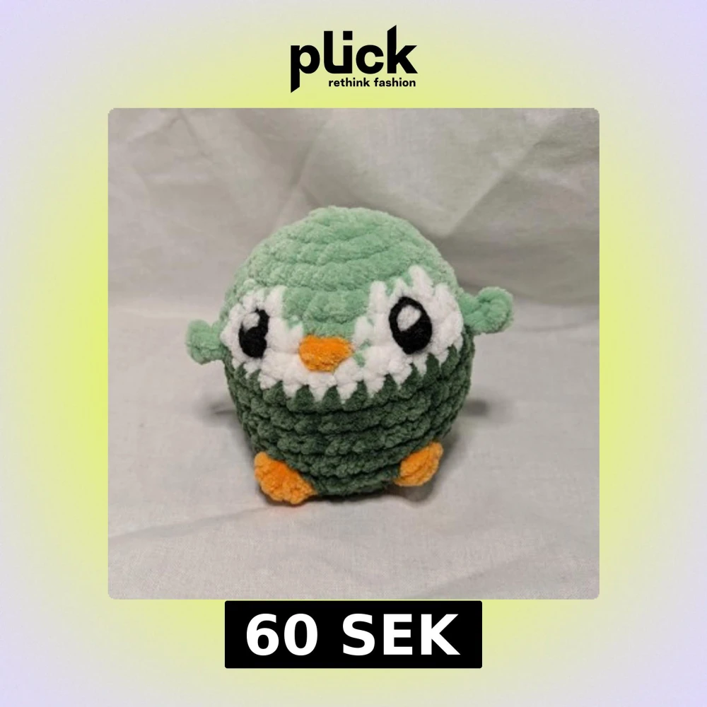 Söt och mjuk virkad pingvinfigur i blått och vitt med orange detaljer. Perfekt som dekoration eller leksak. Den är gjord av 100% polyester. Höjd: 9 cm, bred: 8 cm