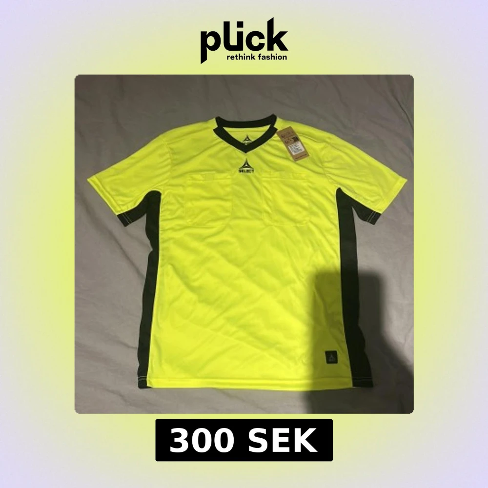 Ordinarie pris 449. Säljer en gul domartröja från Select i storlek small. T-shirten har svarta detaljer längs sidorna och vid kragen, två bröstfickor och en sportig v-ringad design. Materialet är lätt polyester som andas, perfekt för fotbollsmatcher.
