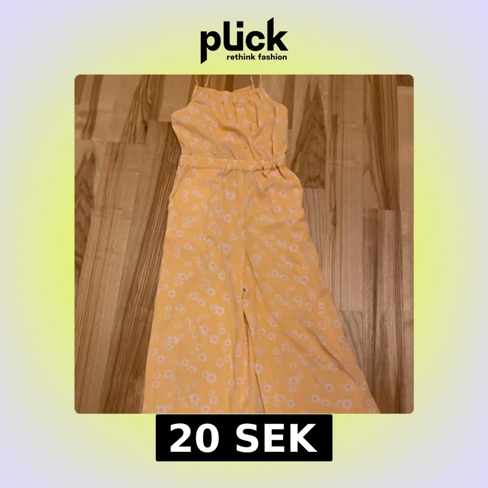 Gul blommig jumpsuit med vida ben och fickor. Den har smala axelband och resår i midjan. Den har små färg fläckar från tuschpenna (se bilder). Därav lågt pris.