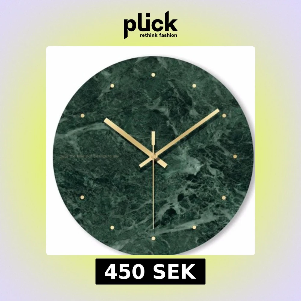 Snygg rund väggklocka med grön marmorerad urtavla och stilrena guldfärgade visare och markeringar. Minimalistisk design som ger ett lyxigt intryck och passar perfekt som statement-piece i rummet.