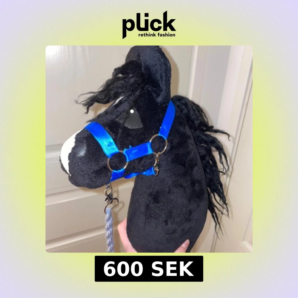 Fin ganska liten käpphäst, svart med vita täcken i ansiktet, några små limfläckar annars bra skick, skickas utan pinne med grimma och grimskaft