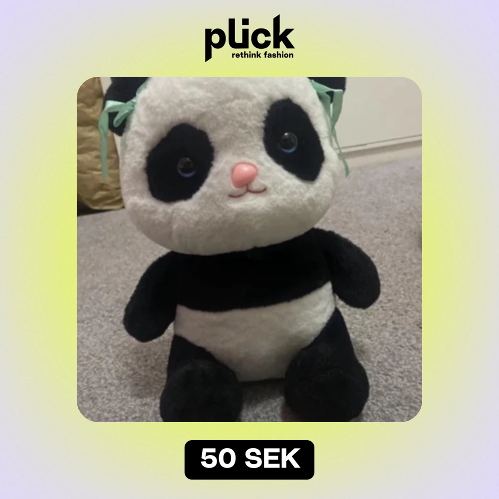 Jag säljer min gulliga gosedjur som är en panda. Hon har rosetter på öronen och har blå ögon och är super gullig