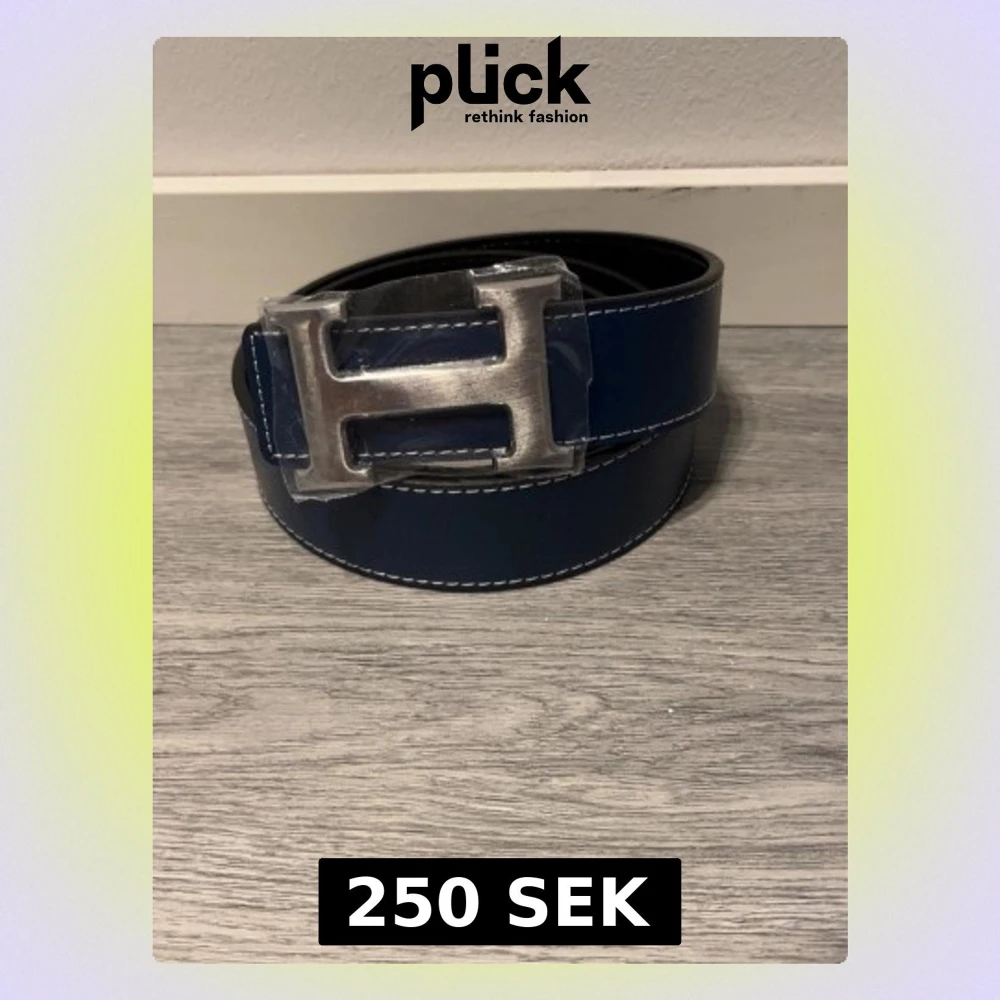 Snyggt bälte i blått och svart skinn med ikoniskt,H-spänne i silverfärgad metall. Bältet har stilrena, kontrastsömmar och klassisk design som lyfter, vilken outfit som helst. Strl 110cm